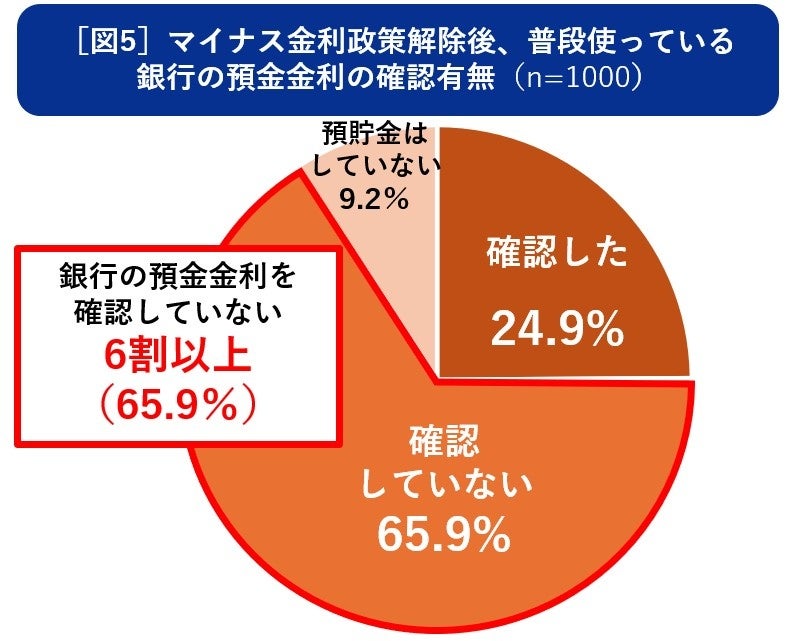今年3月に日本銀行のマイナス金利政策が解除され、政策金利が引き上げられたことに対する認知度を測る質問では、6割以上(65.0%)が「知っている」と回答[図4]。一方で、6割以上(65.9%)の人が、普段使っている銀行の預金金利を「確認していない」と回答しました[図5]。マイナス金利政策解除のニュースは認知しているものの銀行の預金金利への関心は低いという結果になりました。