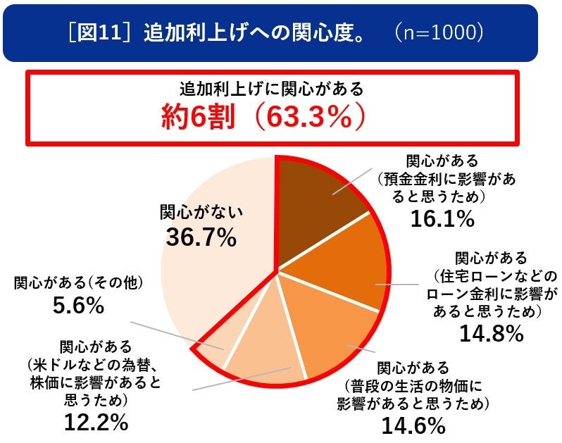 なお、日本銀行の追加利上げについては約6割(63.3%)が関心を持っており、わずかですが「預金金利に影響があると思うため」という理由が最も多い結果となりました[図11]。