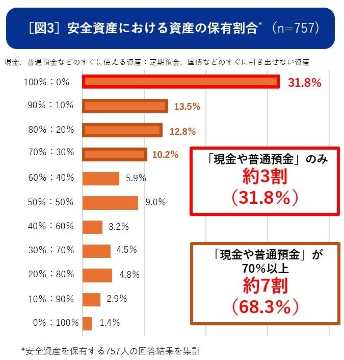 さらに、安全資産を保有している人のうち、約3割(31.8%)の人は「現金や普通預金などのすぐに使える資産」のみで保有しているという結果に [図3]。また「現金や普通預金などのすぐに使える資産」の保有割合が70%以上の人は約7割(68.3%)ということが分かりました [図3]。