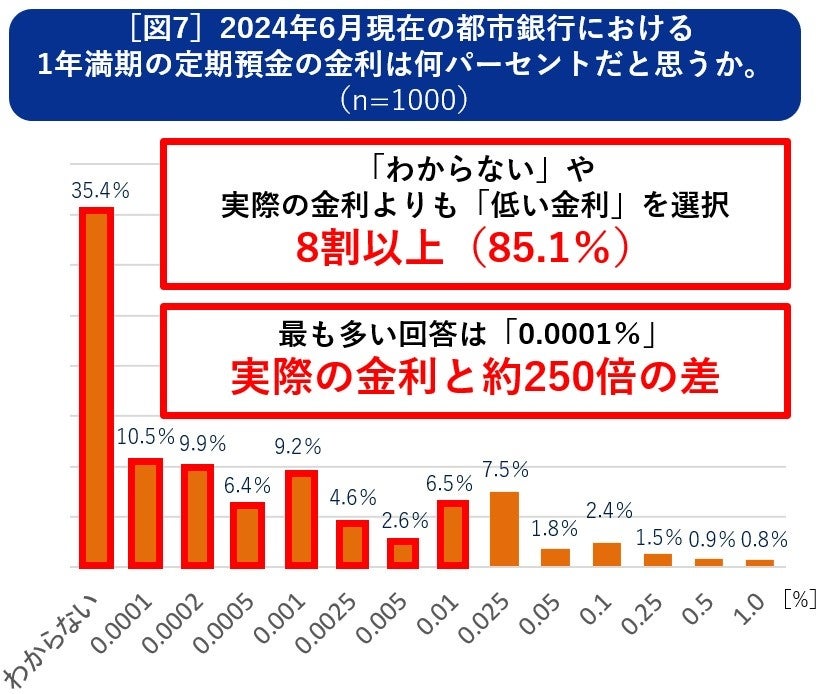2024年6月時点の都市銀行における1年満期の定期預金の金利について聞いたところ、実際の金利0.025%より「低い金利」を回答した人と「わからない」と回答した人が8割以上(85.1%)という結果に[図7]。また、金利の選択肢の中で最も多い回答は「0.0001%」となり、実際の金利と“約250倍の差”が開く結果になりました[図7]。このことから、“銀行の預金金利は低い”という漠然としたイメージが強く残っており、実際の預金金利が徐々に上がってきているという事実に生活者の認識が追いついていないことが推察されます。