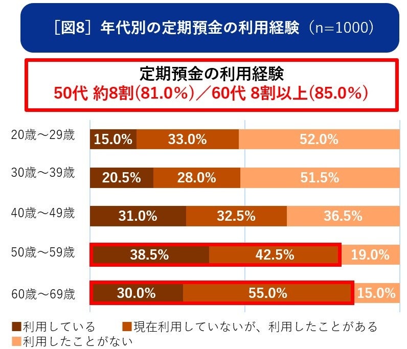60代の定期預金の利用経験者は8割以上(85.0%)。年代が高いほど利用経験が高い。