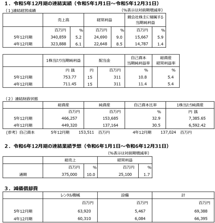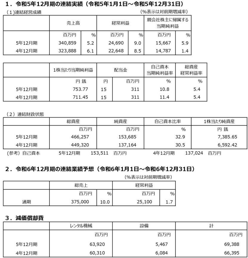 当連結会計年度は、社会経済活動の正常化が進む中、建設業界では資材高騰や人手不足による工事着工遅れ等はあったものの、上記のような諸施策を実行することにより、レンタル需要を確実に受注へ繋げることができました。この結果、売上高340,859百万円(前連結会計年度比5.2%増)、経常利益24,690百万円(同9.0%増)、親会社株主に帰属する当期純利益15,667百万円(同5.9%増)の増収増益の結果となりました。