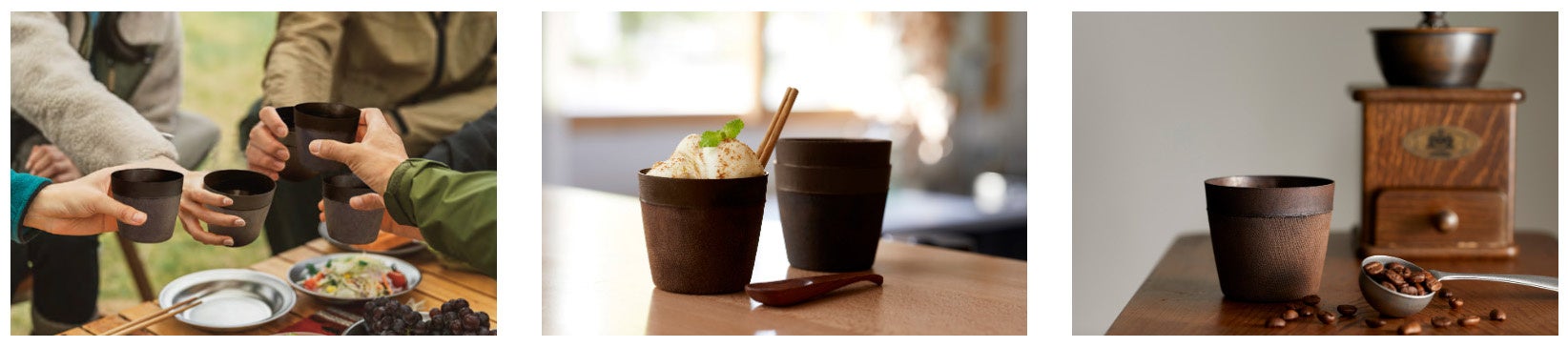 天然漆をカップ全面にコーティングすることで優れた耐久性を実現。なんと強度は一般的な紙コップの10倍以上で、高い耐水性も発揮。食器用洗剤で洗って繰り返し使えるので、使い捨てごみの削減にも繋がります。