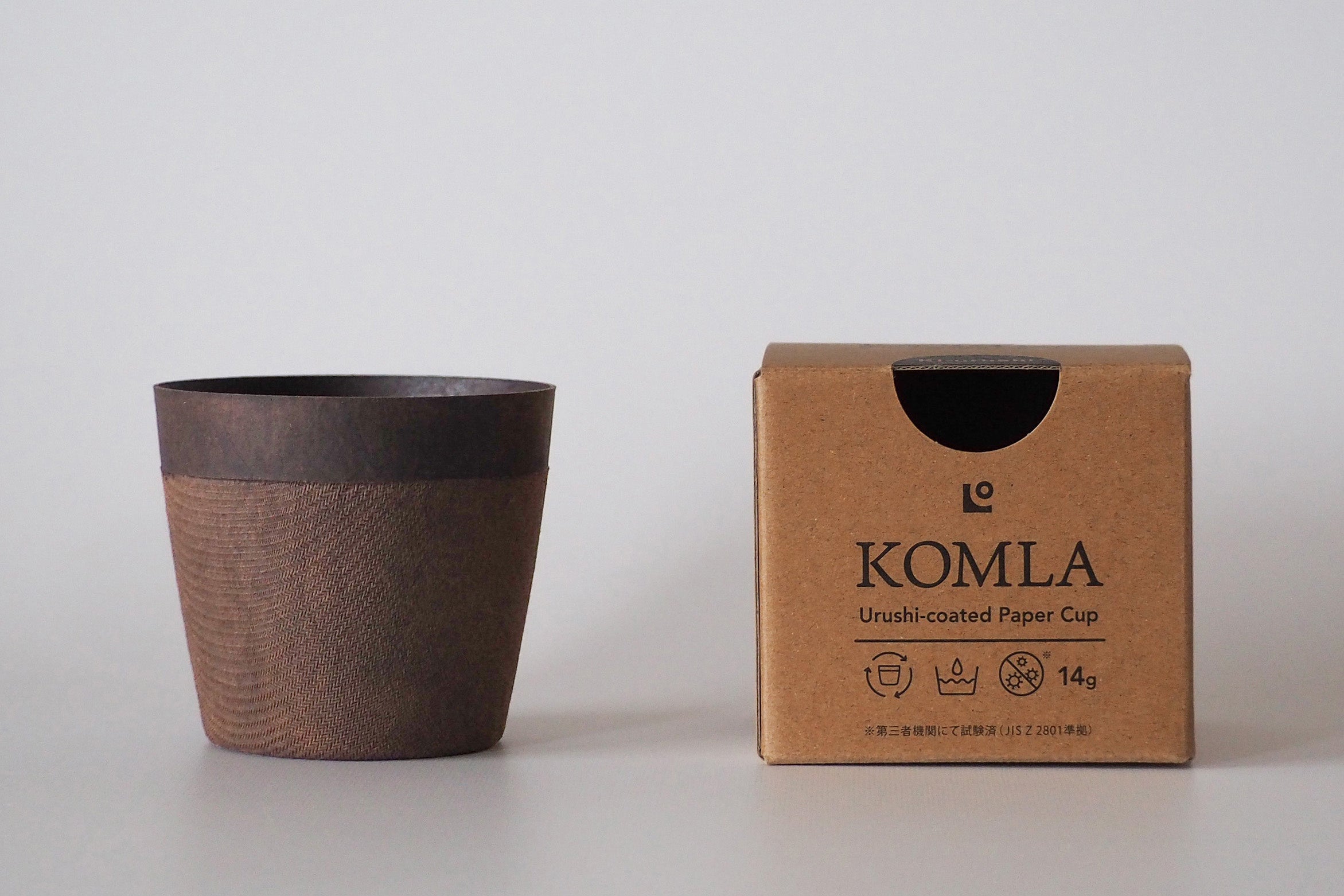 このたび発売する「浮(ふわ)漆 KOMLA(コムラ)」は、重さわずか14gという軽量の新感覚漆器。思わず「なにこれ!?」と言いたくなるほどの独特な佇まいの正体は、なんと紙と漆(うるし)。原料が天然素材にもかかわらず、水にも圧力にも強く、繰り返し洗えて使える機能性に満ちた紙コップです。紙漆の手触りや優れた特性をぜひ体感してみてください。