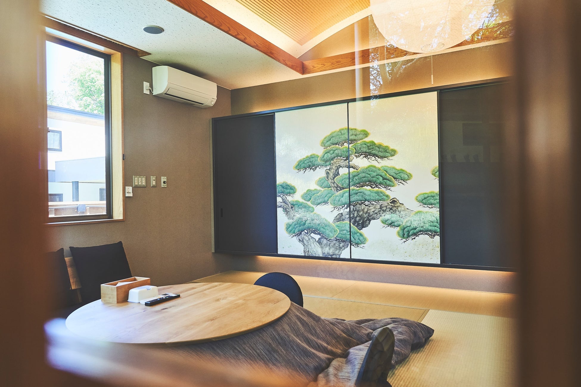 敷地内、多⽬的スペースの⼊⼝には、和室リビン グとカラオケを設けました。印象的な松の襖を開 けると⼤型テレビがあり、畳の上でおくつろぎ頂 けます。冬は炬燵になる⼤きなテーブルでみかんを⾷べながら、カラオケで⼤いに日ごろのストレスを発散してください。
