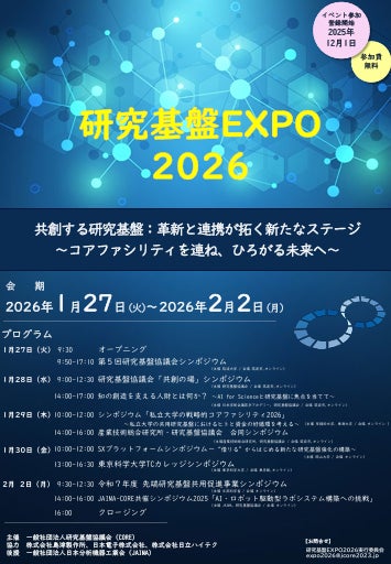 2026年1月27日から1週間にわたって「研究基盤EXPO2026」が開催され、その中で両者の連携協定の記念シンポジウムを開催いたします。研究基盤エコシステムの構築を目指し、両団体の関係者が登壇するだけではなく、内閣府や産業界の方も交えて将来の研究基盤のあるべき姿を探る機会となりますので是非多くの皆様にご参加いただきますようお願い申し上げます。