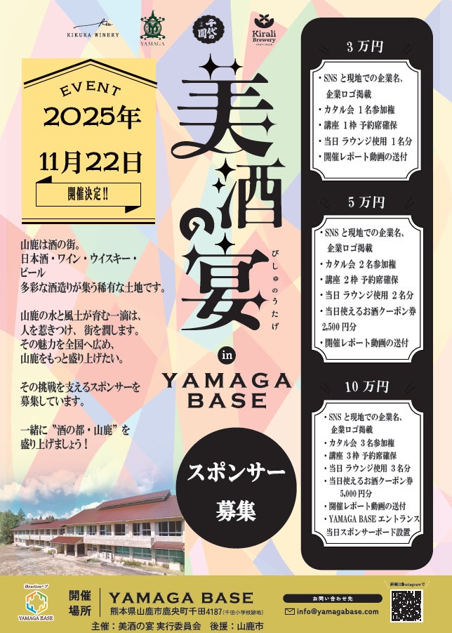 「第二回 美酒の宴 in YAMAGA BASE」では、本イベントと山鹿市の酒文化の魅力を発信し山鹿市をともに盛り上げていただけるスポンサー企業を募集しております。
