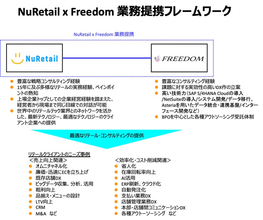 NuRetailは、ファウンダーでCEOの飯田健作の「真のオムニチャネルの推進には、実店舗のDXが不可欠」との思いから設立されました。NuRetailが自社のDXによるオムニチャネル化推進を行なっていく中で、「(リテール企業他社の)企業価値向上全般を支援して欲しい」との多くの声をいただいてきました。NuRetailはリテール・コンサルティング業務の本格始動にあたり、ビジネスパートナーネットワークの拡充を図っておりFreedomとの業務提携はその一つとなります。