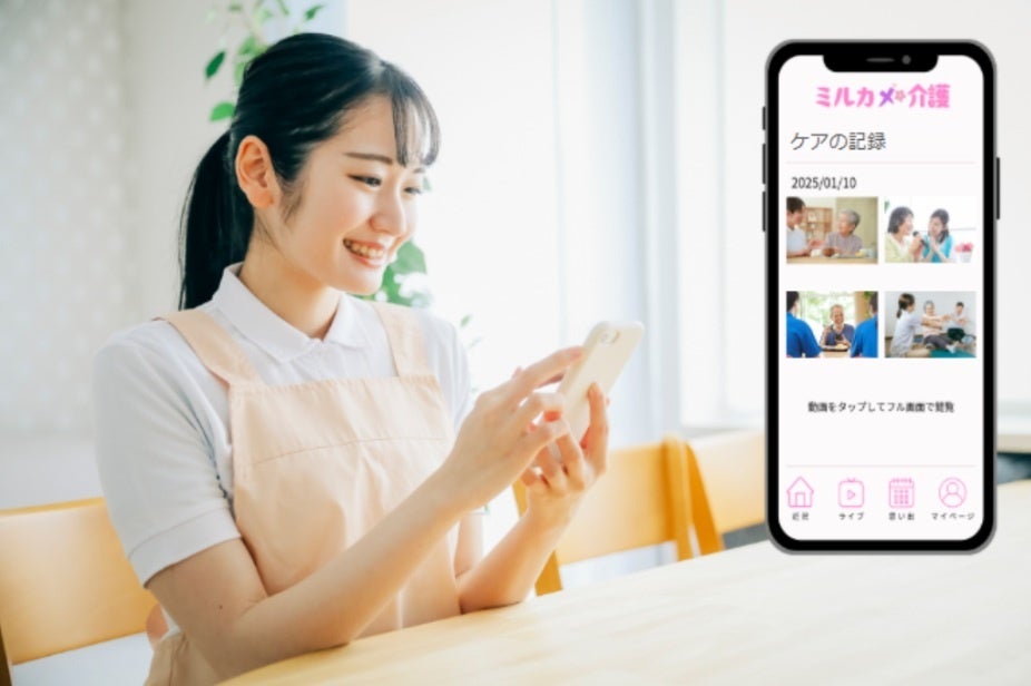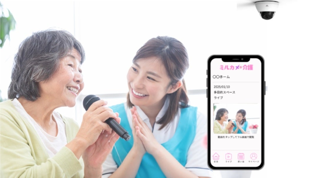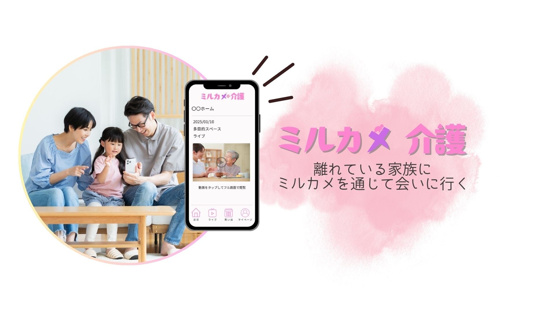 「ミルカメ介護」は、介護施設に設置されたAI搭載防犯カメラを通じて、ご家族の様子をリアルタイムで見守ることができるサービスです。ご家族の方は、仕事や外出中でもスマホやPCから、いつでもどこでもご利用者の様子を確認ができるアプリです。施設側は直感的な操作で動画の配信を行えます。
