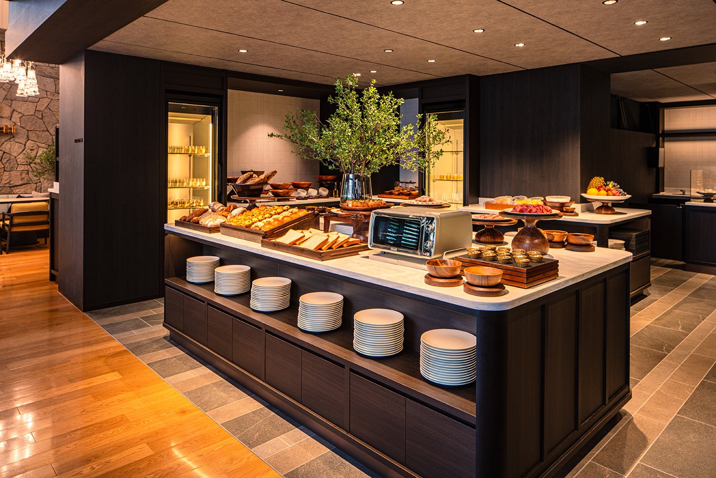 出来立ての料理を提供するライブキッチンを備えたビュッフェコーナーでは、朝食、リフレッシュメント、カクテルアワーの料理やスイーツ、ドリンクをご用意いたします。