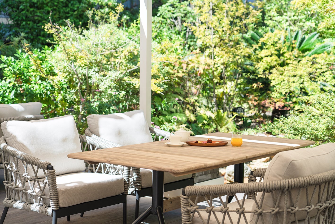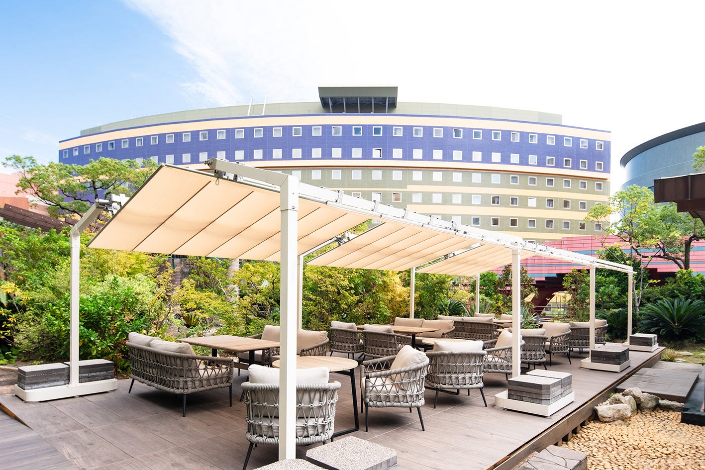 庭園の緑に包まれながら、開放的な気分でゆったりと寛ぐことができるテラスエリア。天気が良い日には朝日とともに朝食を楽しむも良し、爽やかな風を感じながらのティータイムを過ごすも良し。夜にはライトアップされた庭園を眺めながらロマンティックなカクテルアワーを楽しむなど、時間帯によって様々なシチュエーションや過ごし方を叶える、グランド ハイアット 福岡のクラブラウンジならではのスペシャルな空間です。