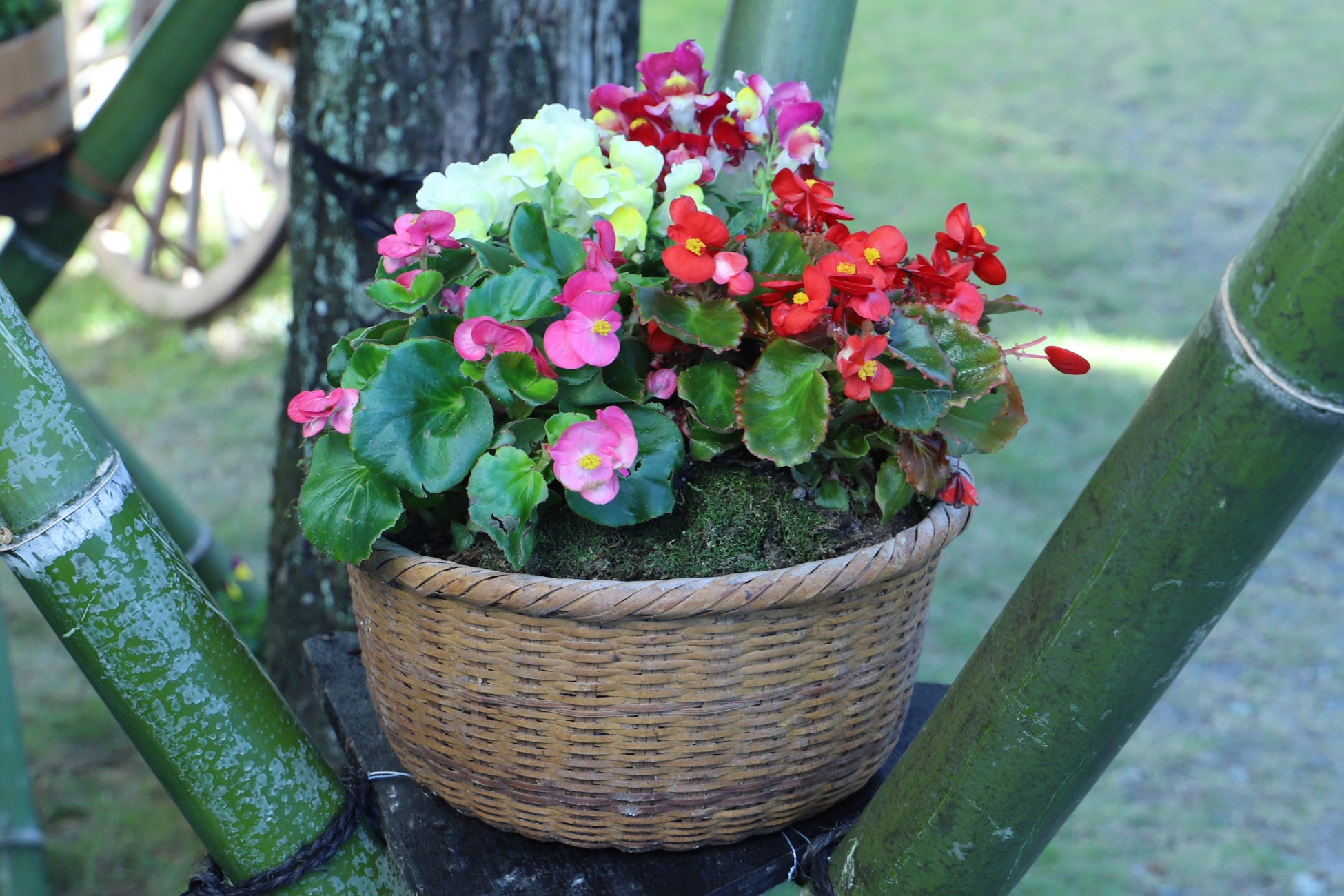 松崎町花の会を中心に、季節の花を昔の農具や桶などを中心に寄せ植えをし、和の雰囲気を感じる