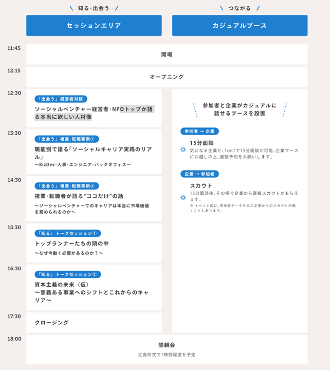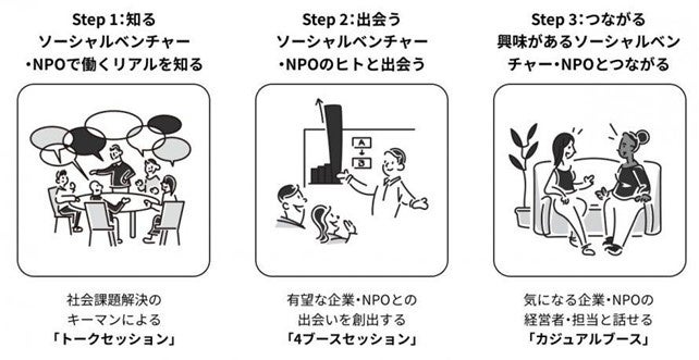 内容 | ・社会課題解決のキーマンによる「トークセッション」 ・有望な企業・NPOとの出会いを創出する「5ブースセッション」 ・気になる企業・NPOの経営者と話せる「カジュアルブース」 |