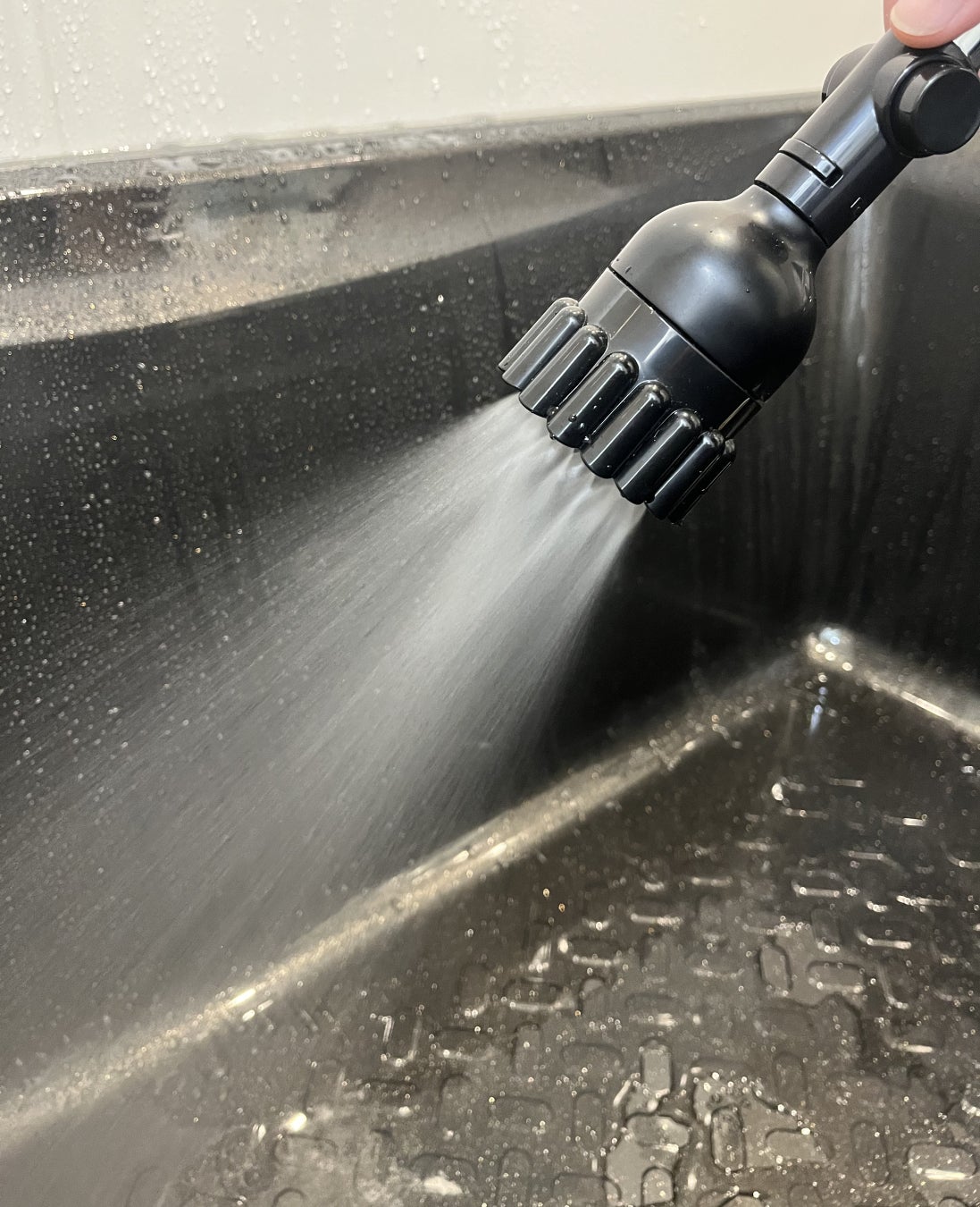 水流を吐出する際に外気を巻き込む特許技術『トルネードミスト方式』で、優しい研磨剤のような役割を果たす『ウルトラファインバブル』を安定生成し、汚れを落とします。従来の水栓と比べて気泡による洗浄効果が加わるため、より効率的な洗浄作業が行えるほか、浸透しやすい水質の影響により、お肌のうるおいがアップし、手荒れの軽減効果も期待できます。また、洗浄効果の上昇による洗剤の使用量削減が期待できるだけではなく、吐水の際に空気を取り込むため、既存の水栓からの吐出の際と比べて50%以上の節水が可能となり、水仕事における環境と従業員への負担軽減を実現できます。