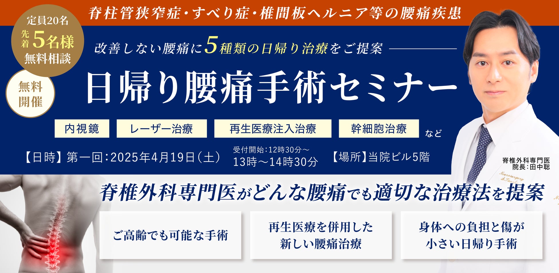 今回のセミナーでは、脊椎外科専門医が最新の低侵襲手術について脊椎外専門医である当クリニックの田中院長が、「ボルトを入れたくない」「入院は難しい」「症状が改善せず困っている」という方に、新たな一歩となる内容をお届けします。