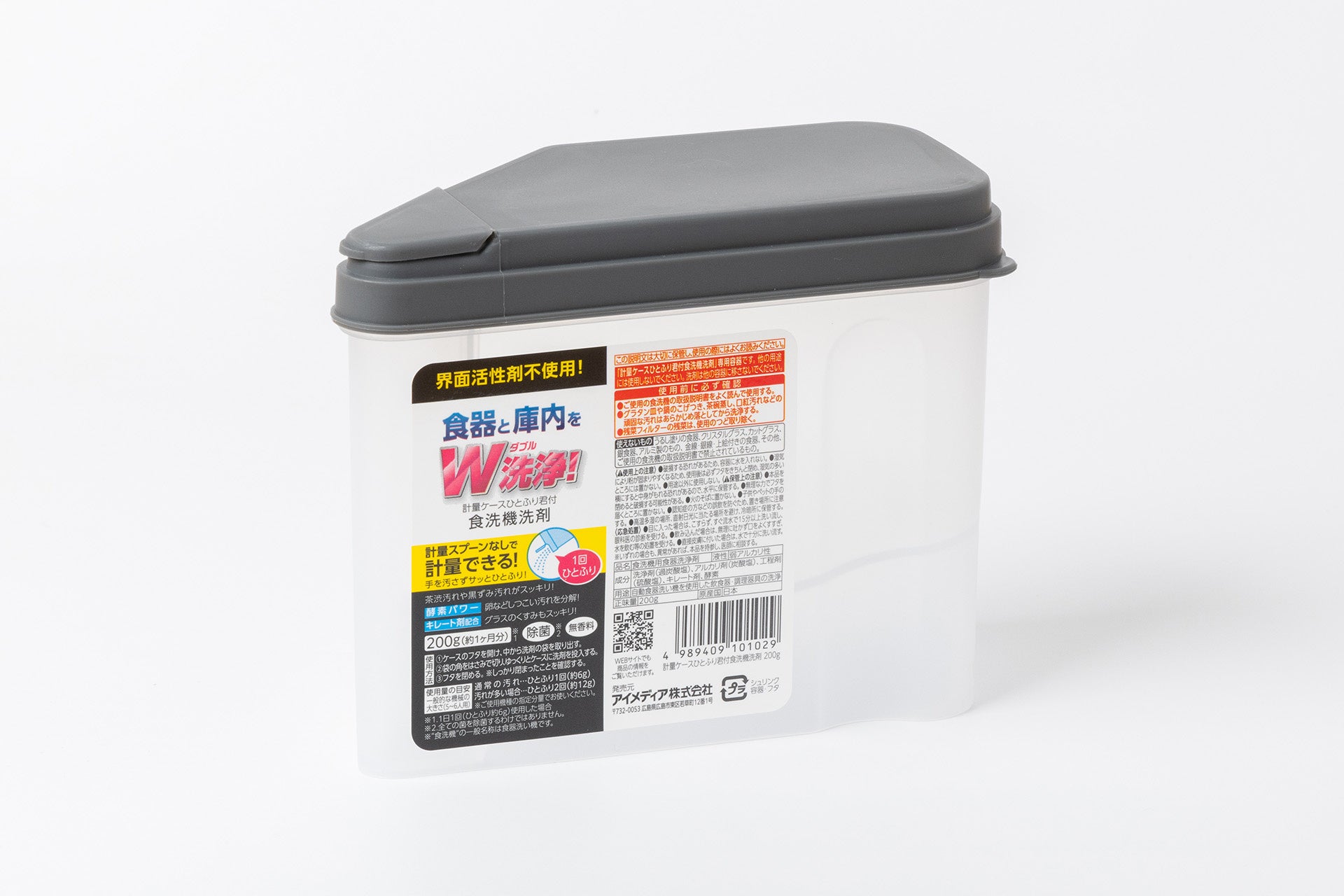 意匠登録済の専用ケースが付いた粉末タイプの食洗機用洗剤。