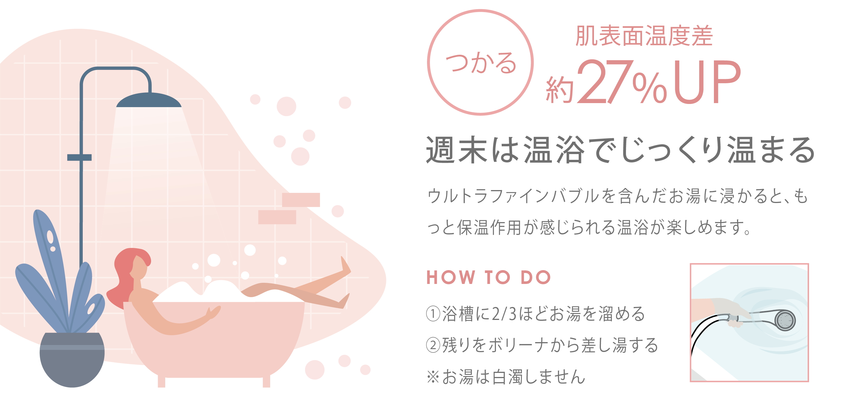 ウルトラファインバブルがたっぷり含まれたシャワー水流は毎日の手軽なフェムケアに活用できます。浴びることで、体の表面温度差がアップ。さらに差し湯をすることで温浴が可能です。
