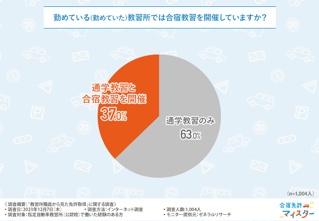 はじめに「勤めている(勤めていた)教習所では合宿教習を開催していますか?」と質問したところ、『通学教習のみ(63.0%)』『通学教習と合宿教習を開催(37.0%)』という回答結果になりました。