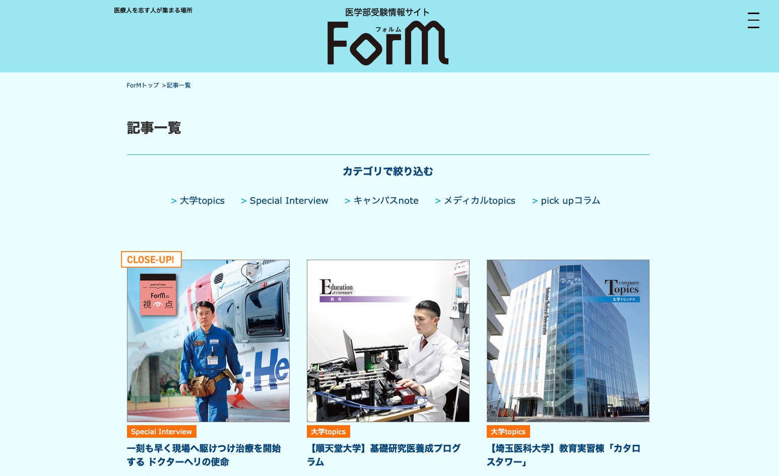 「大学topics」「Special Interview」「キャンパスnote」「メディカルtopics」「pick upコラム」5つのカテゴリーで展開。私立医科大学の新鮮な情報を中心に、医師のインタビューや医学生の声、医療関連のトピックスなど、医学部受験に有益な記事を発信します。