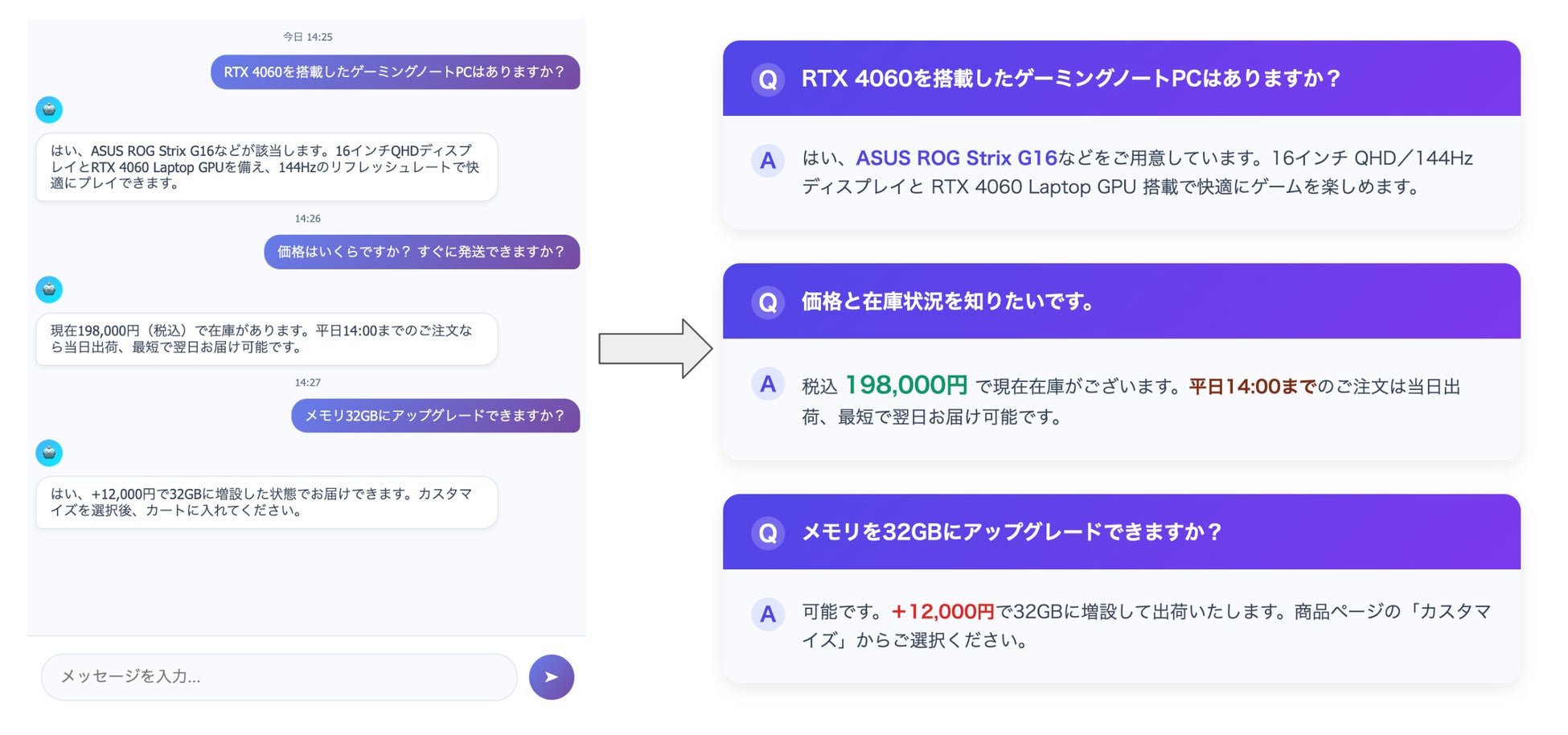 化粧品EC:使用感や成分に関する質問を自動FAQ化 → 購入前の不安を解消しコンバージョンUP。
