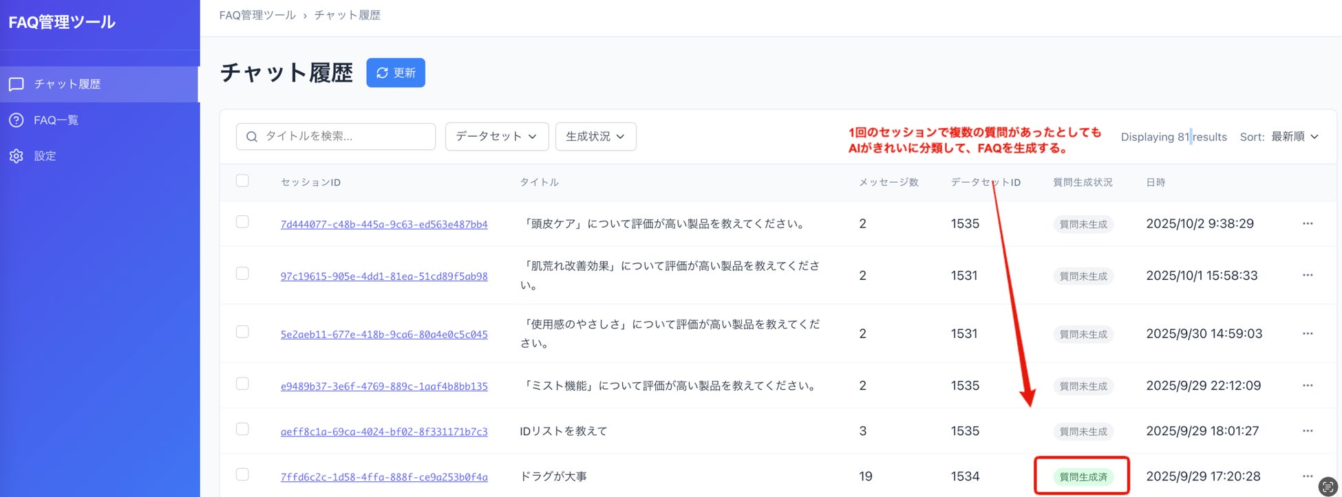 新しい会話が発生するたびにFAQが更新されるため、 ・新商品の情報 ・季節ごとのニーズ ・トラブル対応事例 といった内容をリアルタイムで反映できます。