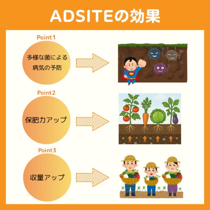 ADSITEは土の中で起こっている養分や微生物の働きを良くし、いろんな野菜、果物、植物のサポートをしていきます。