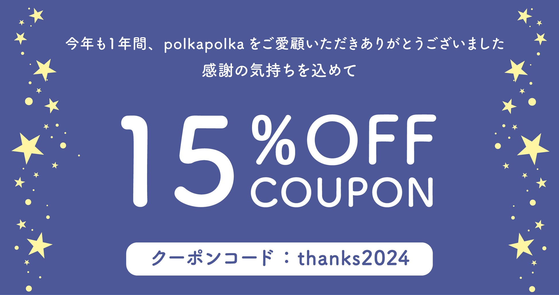 【polkapolka】2024年ありがとうBIGクーポン!12月20日(金)から配布開始!アパレル雑貨全品15%OFFで年内最後のお得なお買い物をお楽しみください!