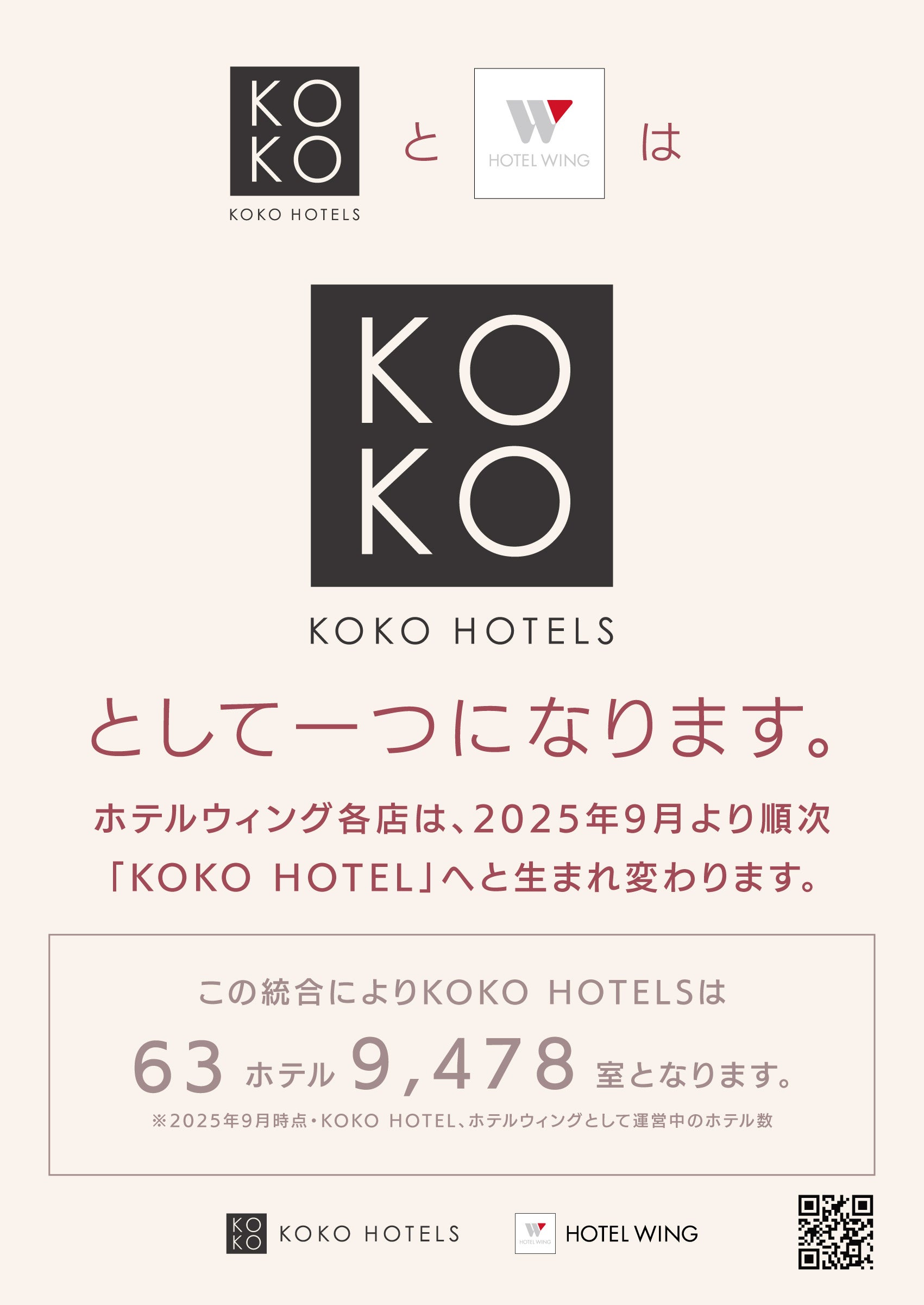 今回のブランド統合により、『KOKO HOTELS』は全国63ホテル・9,489室の規模となります。