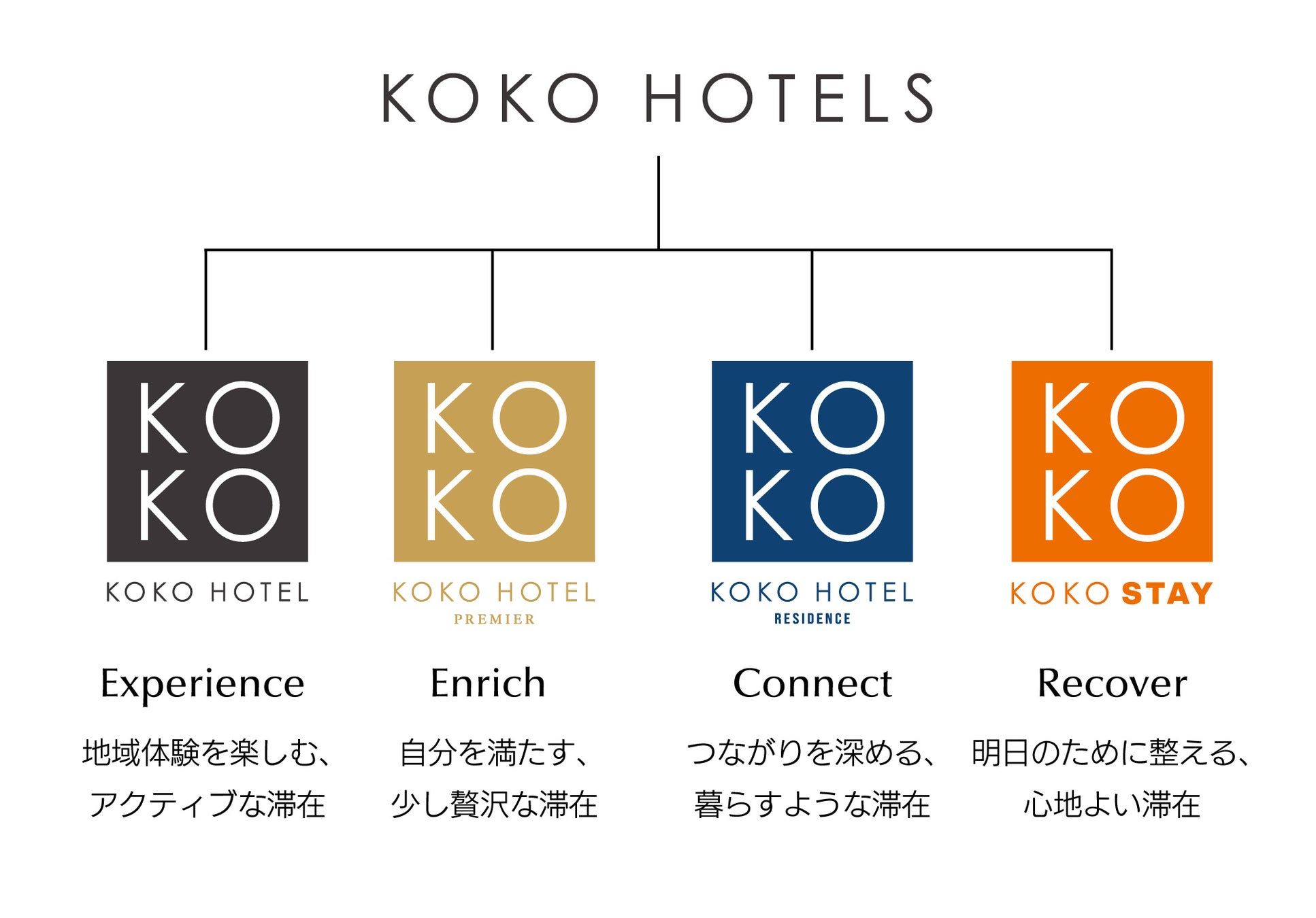 KOKO HOTELSは既存の3ブランド【KOKO HOTEL】【KOKO HOTEL Premier】【KOKO HOTEL Residence】に、新たに【KOKO STAY】が加わります。