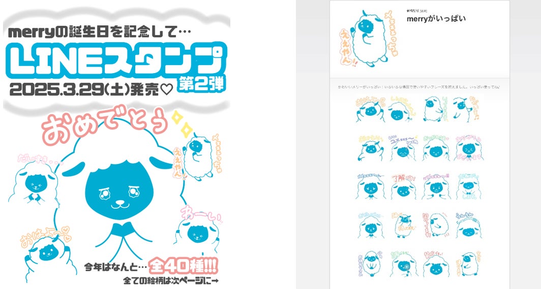 社内外からの要望も受け、メリーのLINEスタンプ第2弾の発売が決まりました。発売日の3月29日はメリーの誕生日です。羊のキャラクター・メリーは弊社が製造するトイレットペーパーのパッケージ、うちわやカレンダーといったグッズにデザインされるなど、広報の役割を担っています。