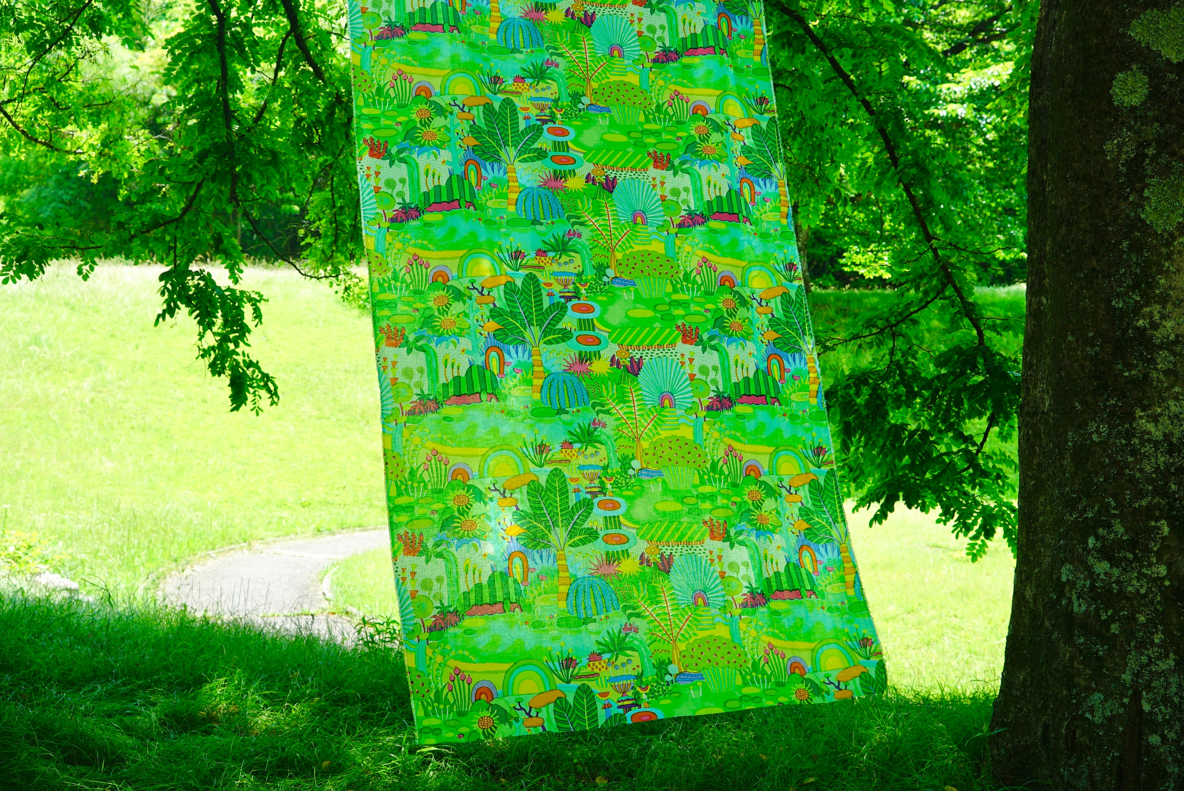 新作の柄「ロータスの森」は、ちょうどこの時期の日本では植物が最も喜ぶ季節を描き、その他のテキスタイルにも物語が一つ一つ込められています。