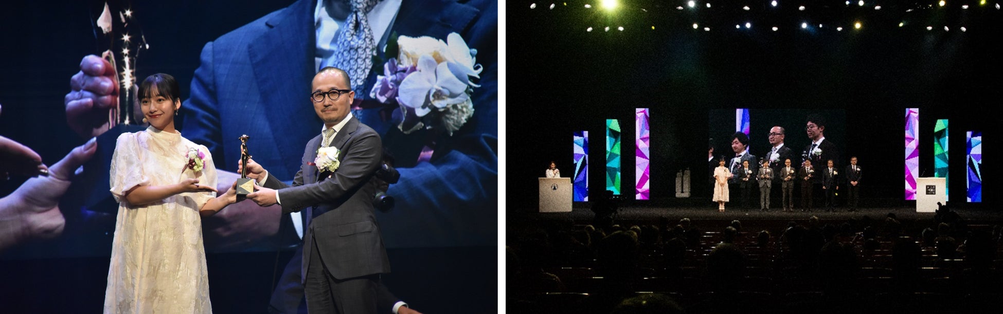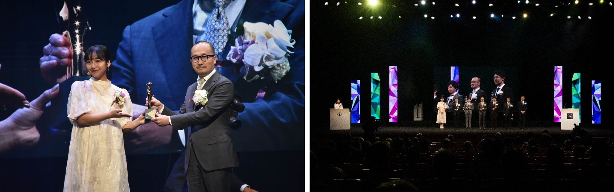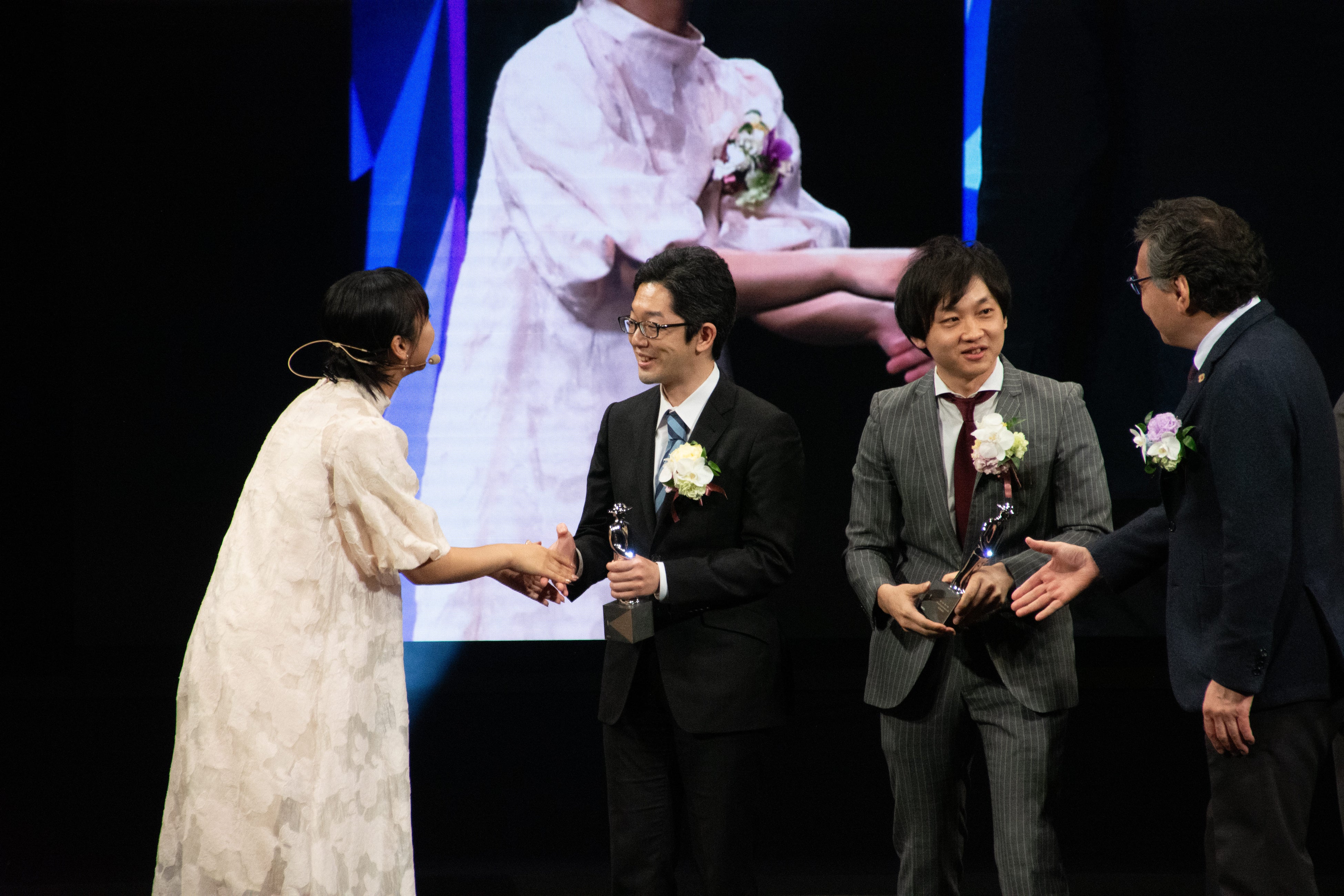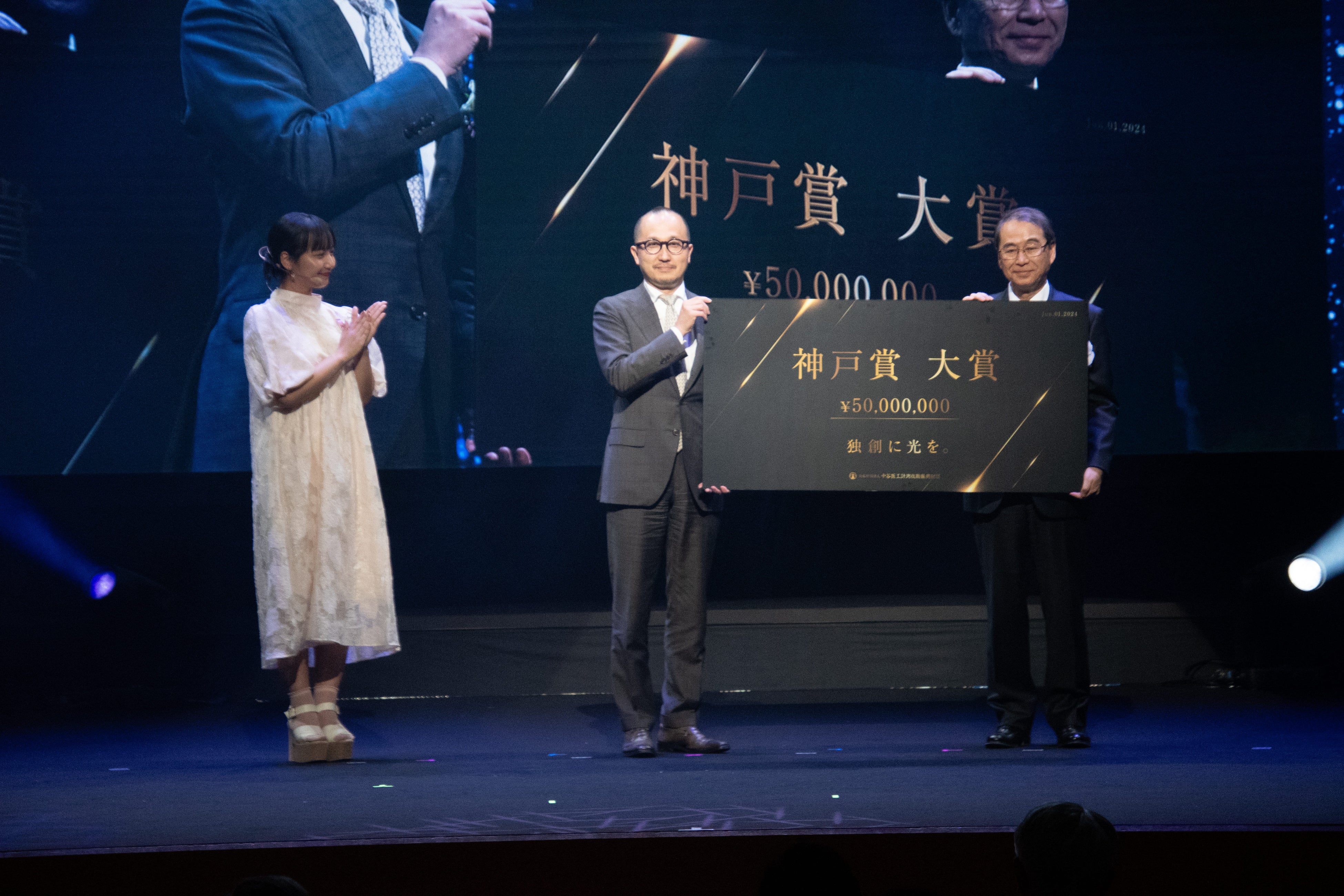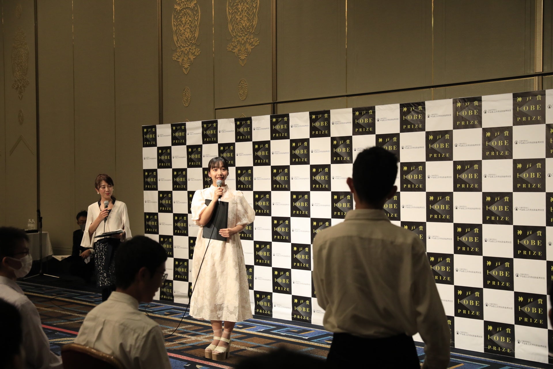 そして、神戸賞アンバサダーである山之内すずさんからトロフィー、代表理事の家次から賞状と副賞が、受賞者4名の方々へ手渡されました。トロフィーは、研究者の独創性を「暗闇の中の光」として捉え、それを体現するイメージでデザインされています。メッキ素材で仕上げた彫像の中に、点灯機能を組み込まれており、見た目の艶やかさだけではなく、実際に光を灯すユニークな設計です。