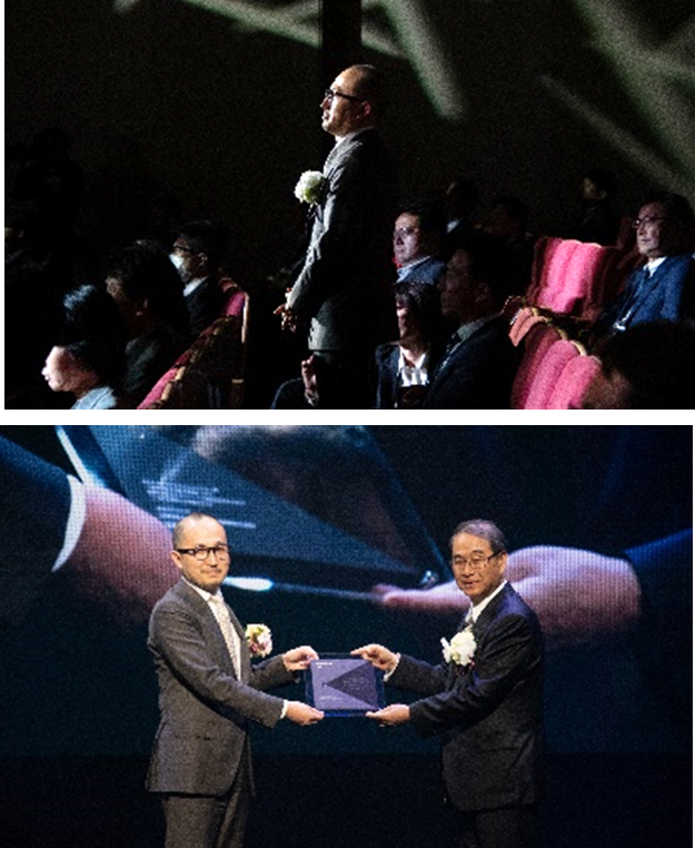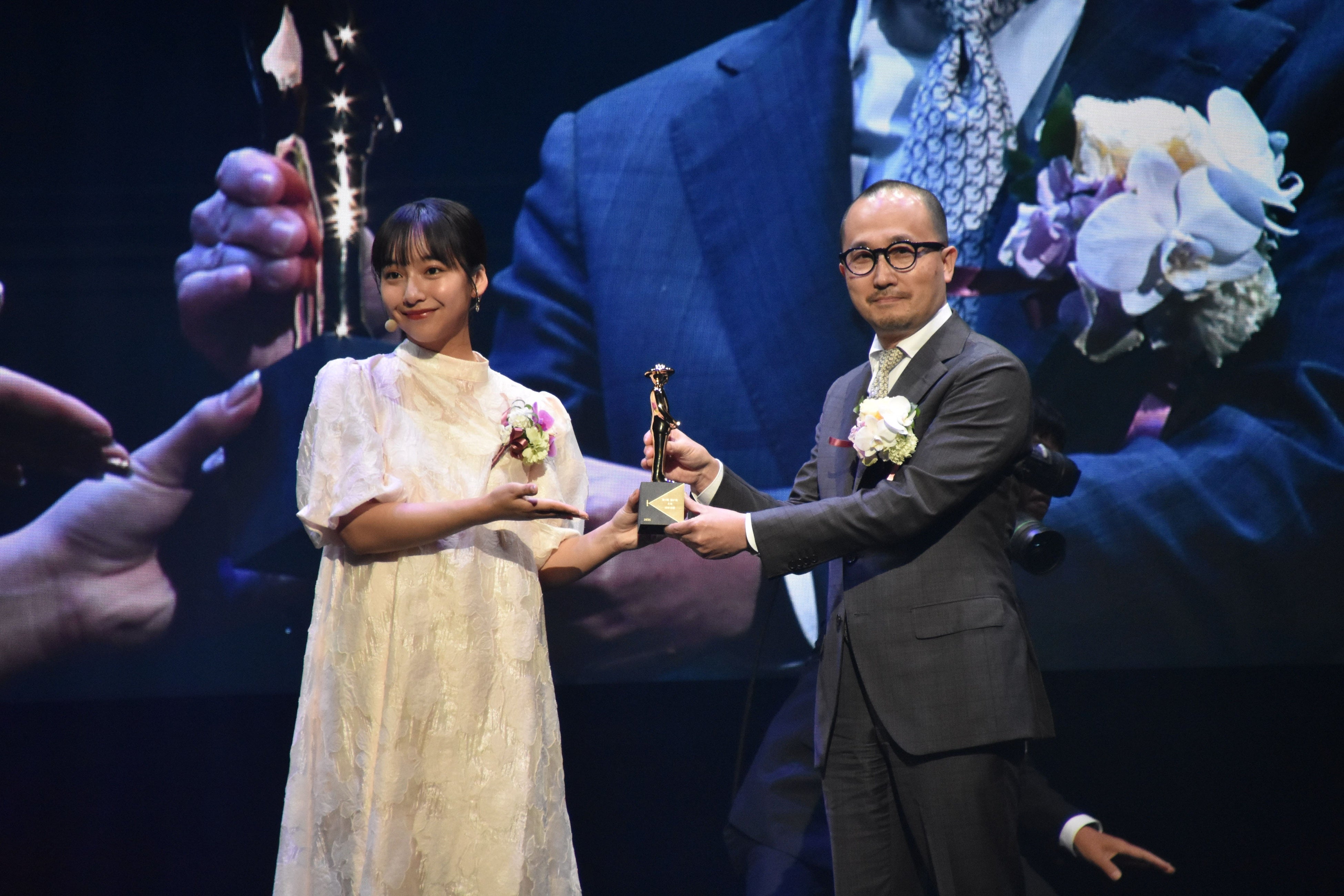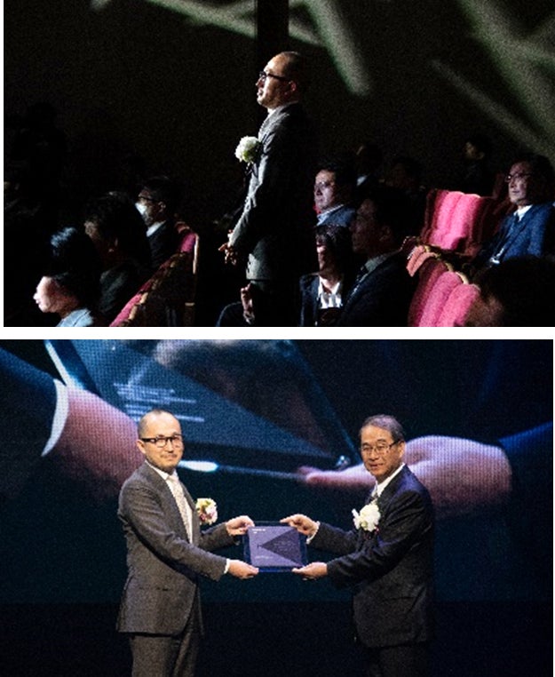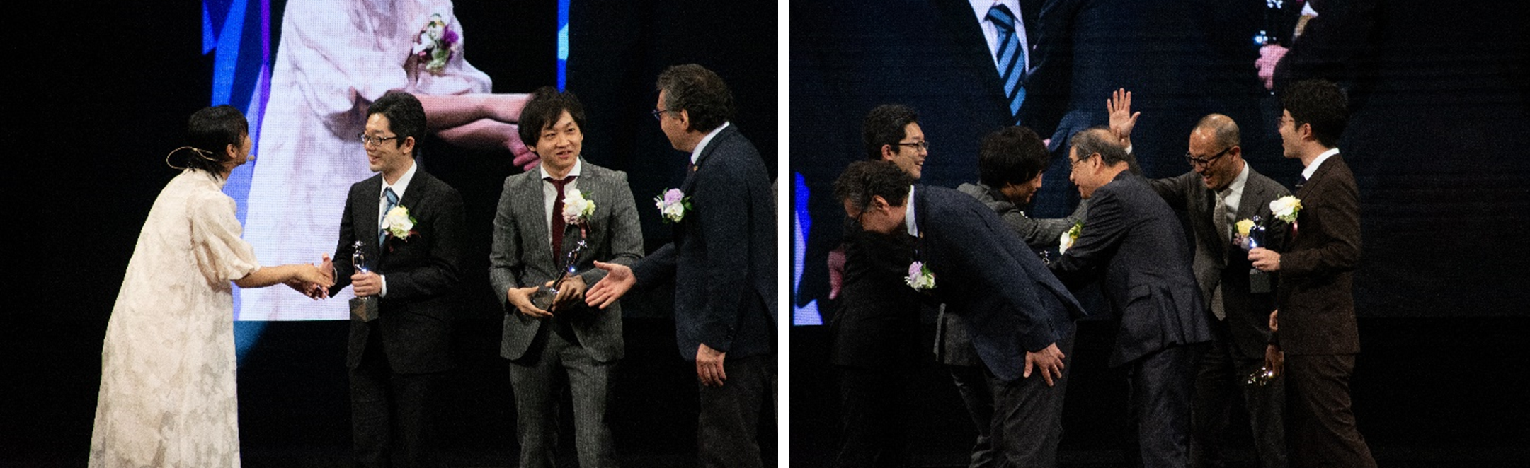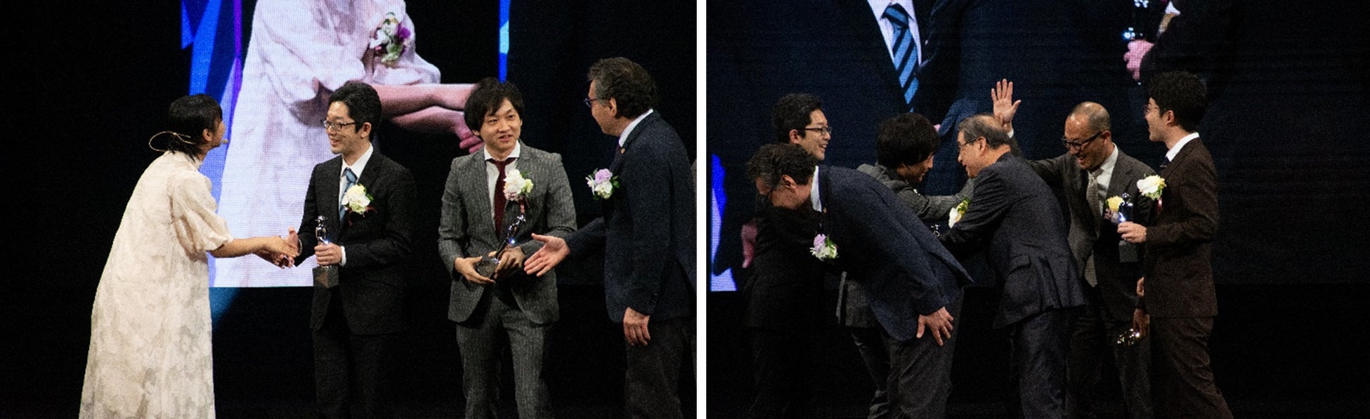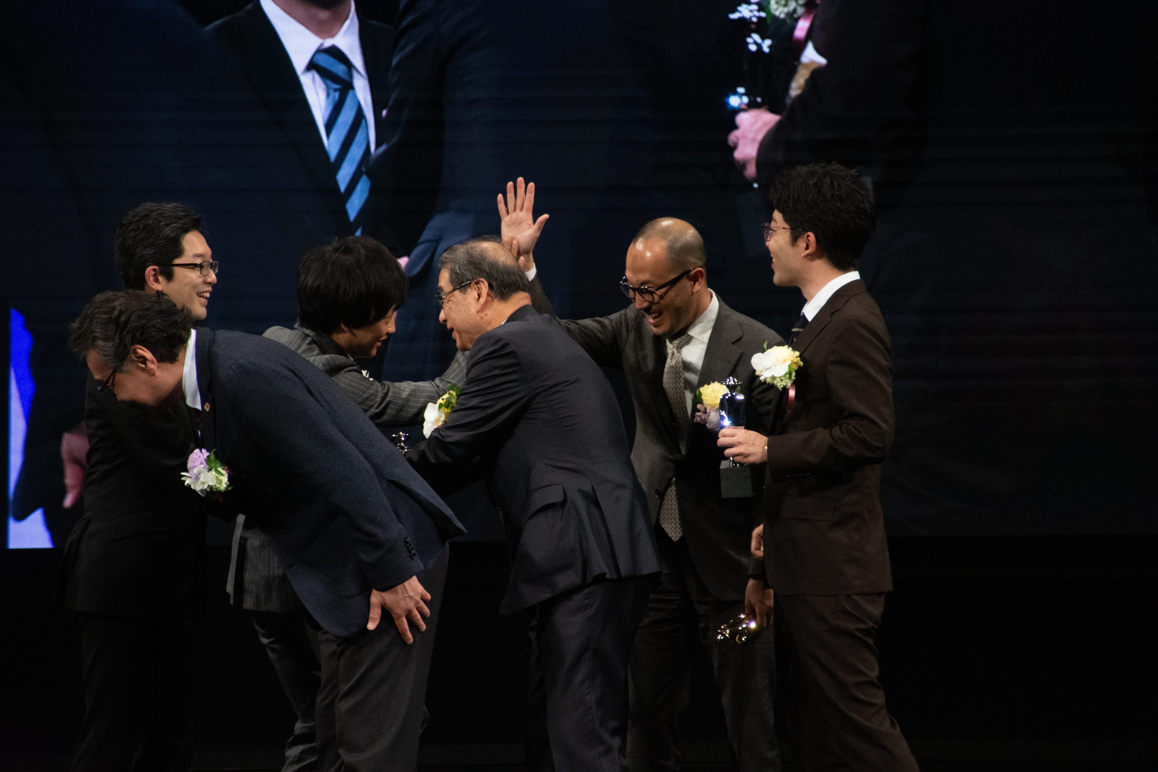 そして、神戸賞アンバサダーである山之内すずさんからトロフィー、代表理事の家次から賞状と副賞が、受賞者4名の方々へ手渡されました。トロフィーは、研究者の独創性を「暗闇の中の光」として捉え、それを体現するイメージでデザインされています。メッキ素材で仕上げた彫像の中に、点灯機能を組み込まれており、見た目の艶やかさだけではなく、実際に光を灯すユニークな設計です。