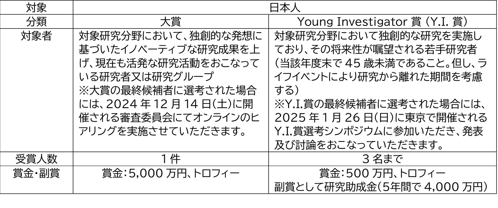 賞金・副賞:賞金500万円、副賞 トロフィー、研究助成金4,000万円(5年間)