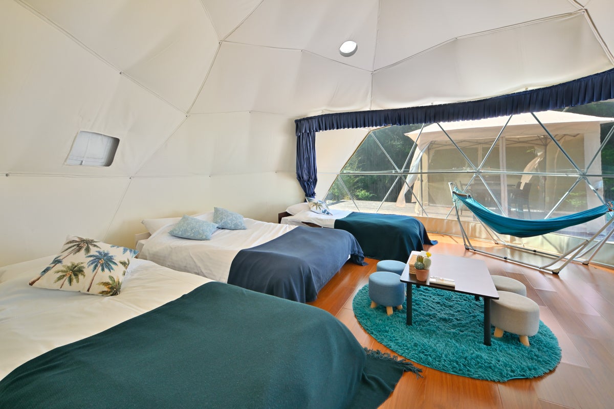 宿泊には快適な冷暖房を完備したドーム型テントをご用意。アウトドア初心者や小さなお子様連れのご家族でも安心して滞在いただけます。