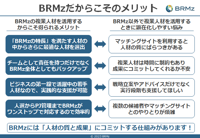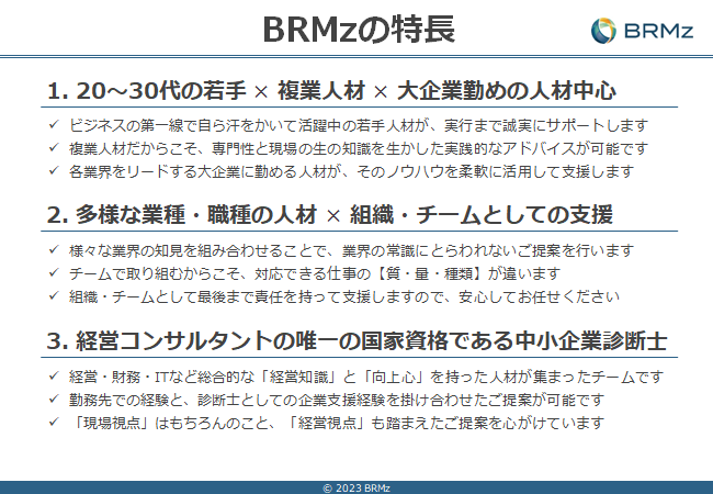 BRMz合同会社(本社:東京都渋谷区、代表社員:川村匡弥、以下BRMz)は、「BRMzコミュニティ」(以下コミュニティ)に所属する若手複業人材でチームを組み、企業の経営課題解決を支援しております。