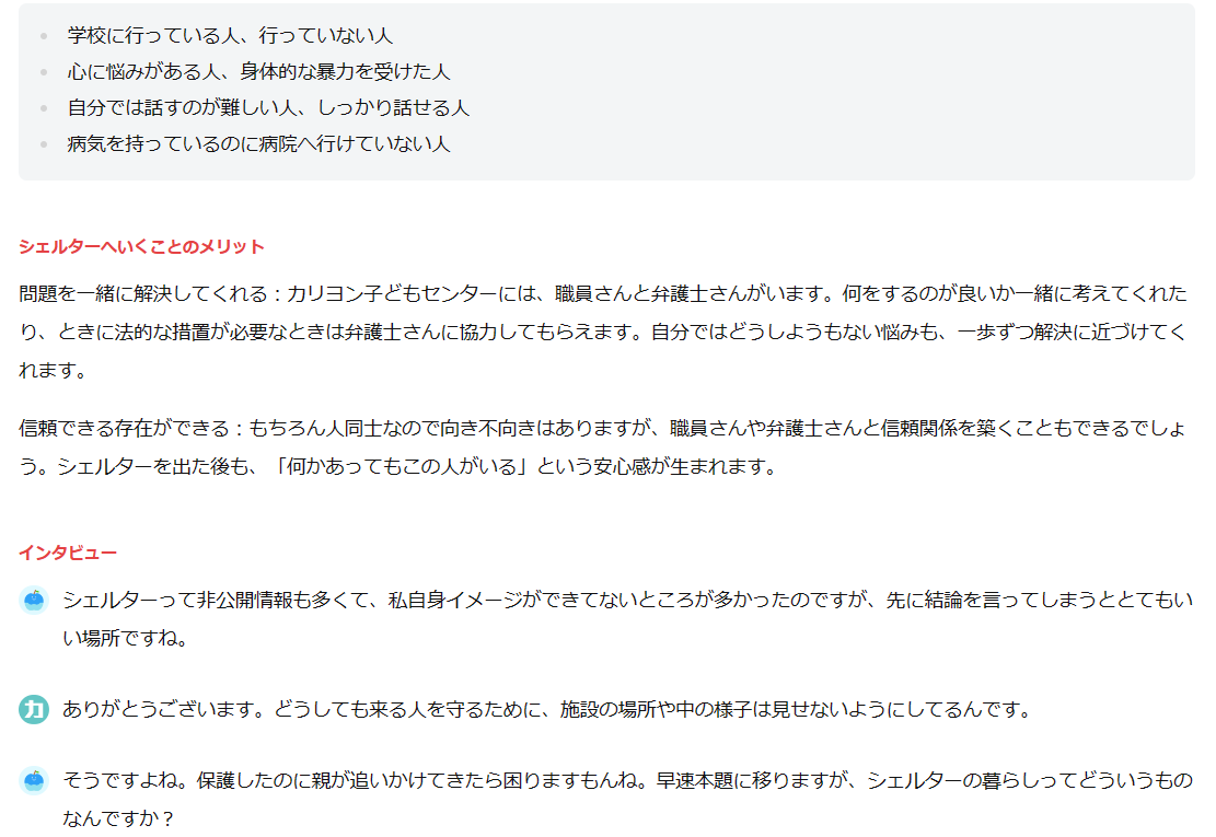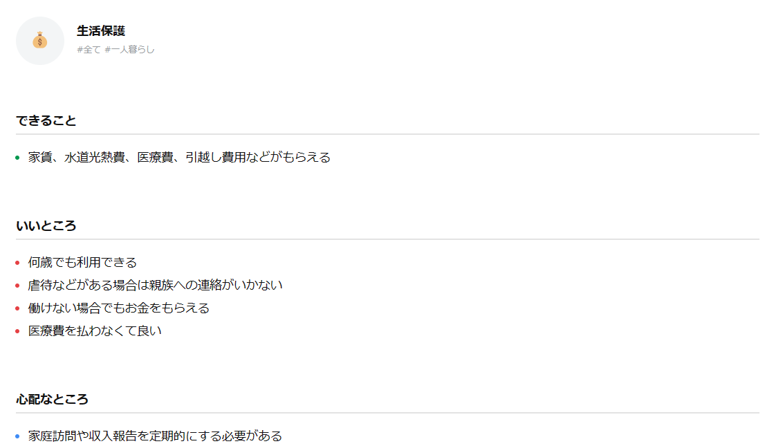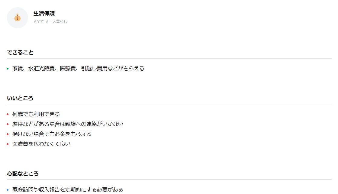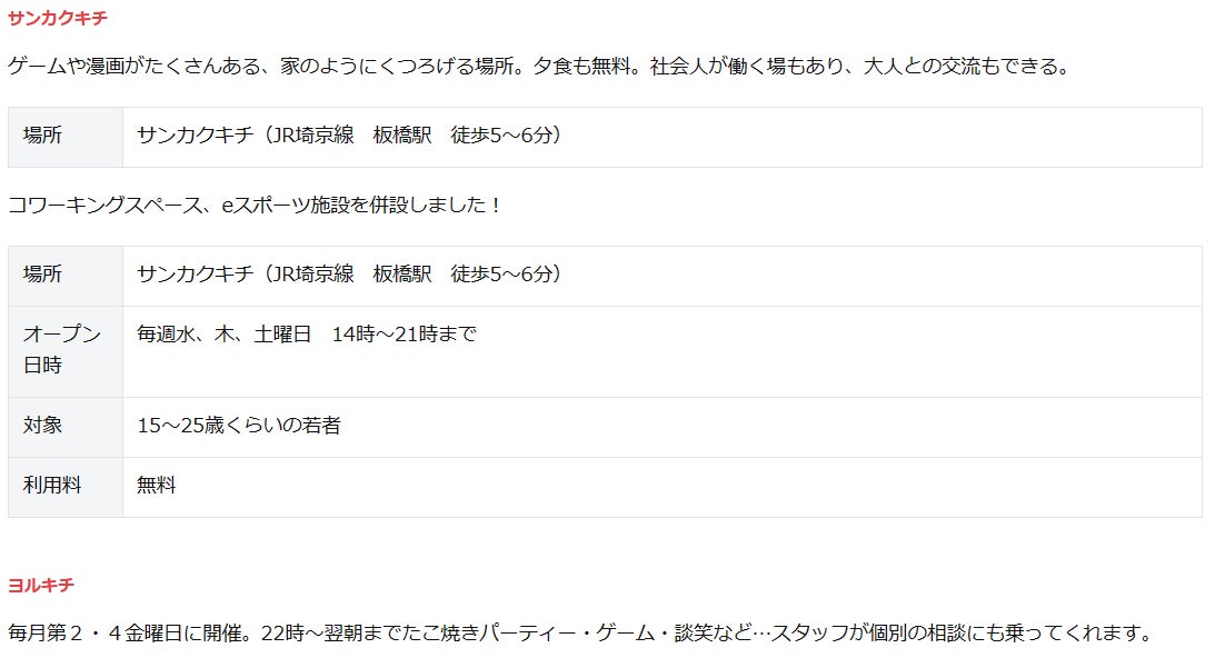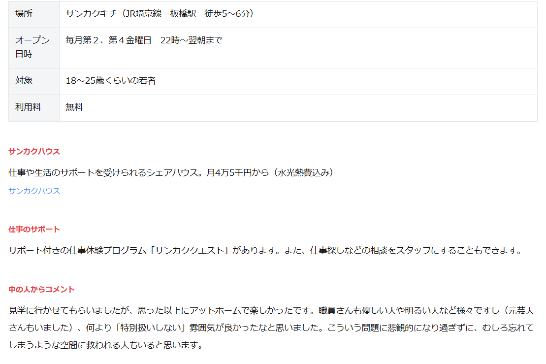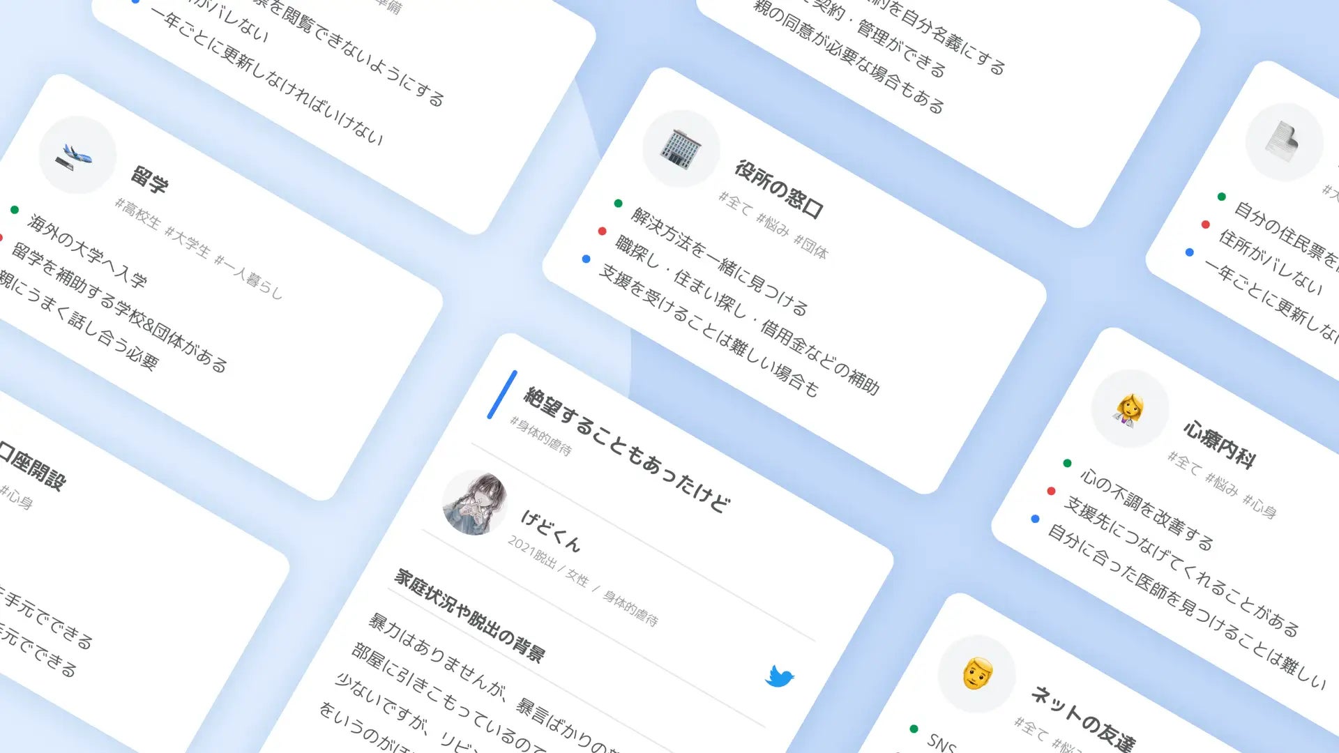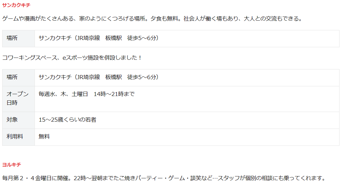 公的な支援から民間サービスや身近な頼れる人まで、「新たな居場所を見つけるための情報」を体系的に掲載しています。経験者約100人の調査から作成しました。今回は、ユーザーから「さらに調査してほしい」「これが便利だったのでもっと広めてほしい」と要望があった項目についてアップデートをおこなしました。