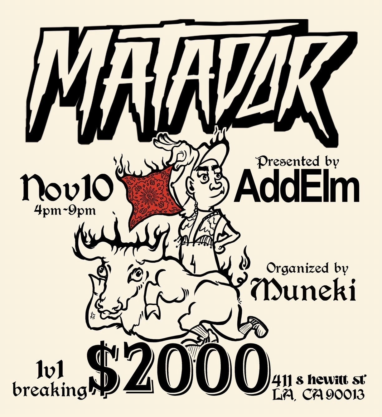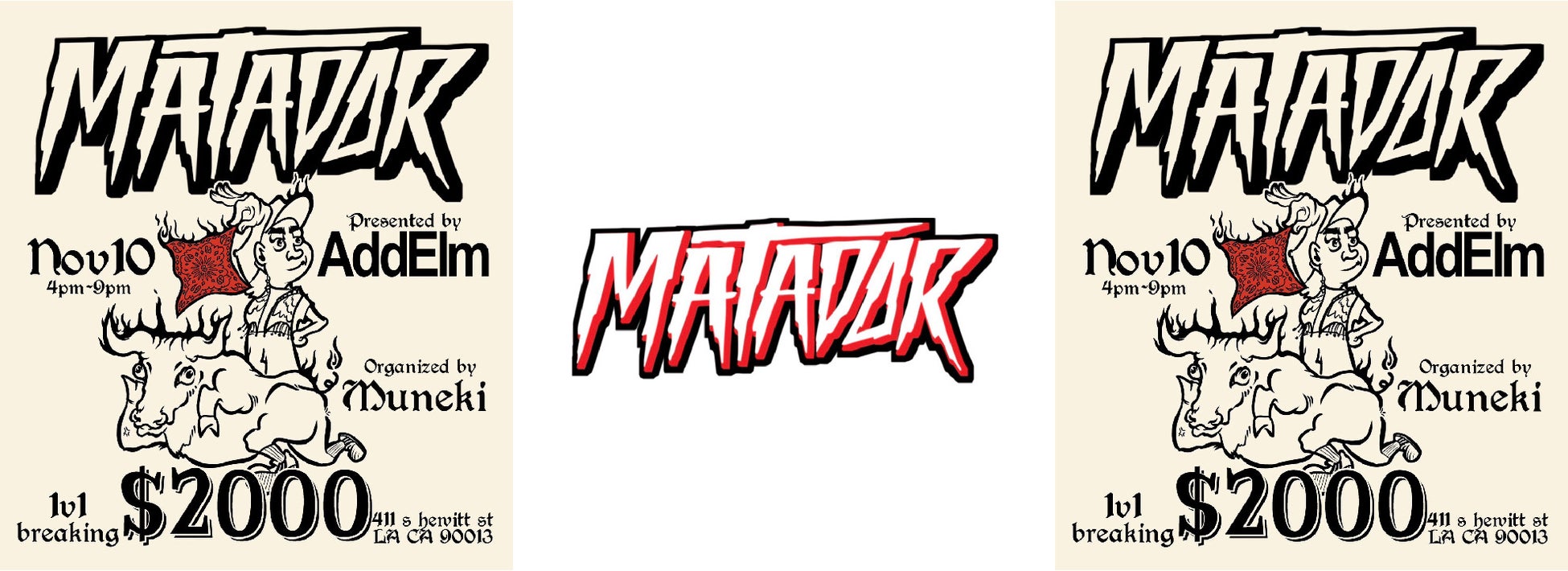 この「MATADOR」はUS最大のブレイキンバトルイベントである「Freestyle Session」の前夜に開催される。MATADORはAddElm TECHNOLOGYが冠スポンサーとして開催し、世界TOPブレイカー7名の招待と、LAローカル(自由参加型)のブレイカーが賞金$2,000(約32万円)と翌日の「Freestyle Session」への参戦チーム「Team MATADOR」として出場する、参戦権をかけてサイファーバトルを繰り広げる正にストリートスタイルのバトルトーナメント。