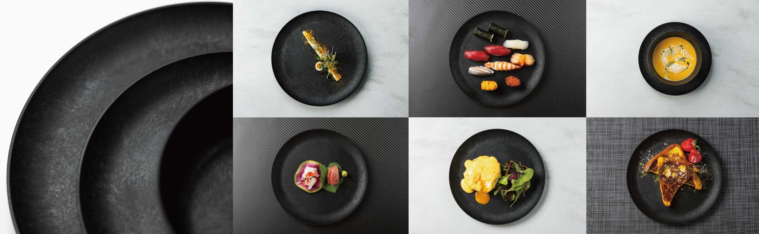 食材を引き立てる影としての黒。黒の濃淡グラデーション。木の粉のテクスチャー。繊細に薄く立ち上がるエッジ。研ぎ澄まされたシンプルな3つの形態が、食体験を切り取り、空間を彩る。