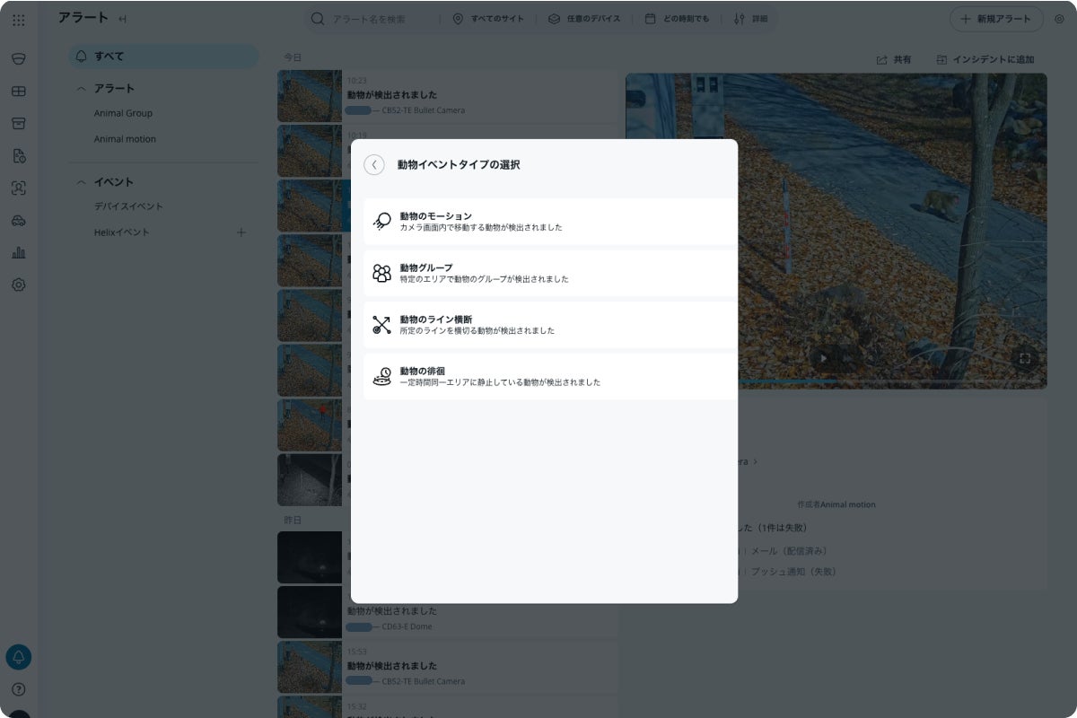画角内での動物の動きや任意のラインの横断などを自動検知し、通知(VerkadaスマートフォンアプリやEメールなど)