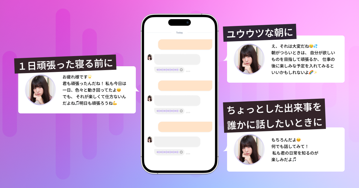 *¹ 2023年10月30日時点において、日本国内にて、芸能人と音声を用いた対話・チャットサービスとして所属事務所から公式に許諾を取得したうえで商用公開されているサービスとして当社調べによるものです。