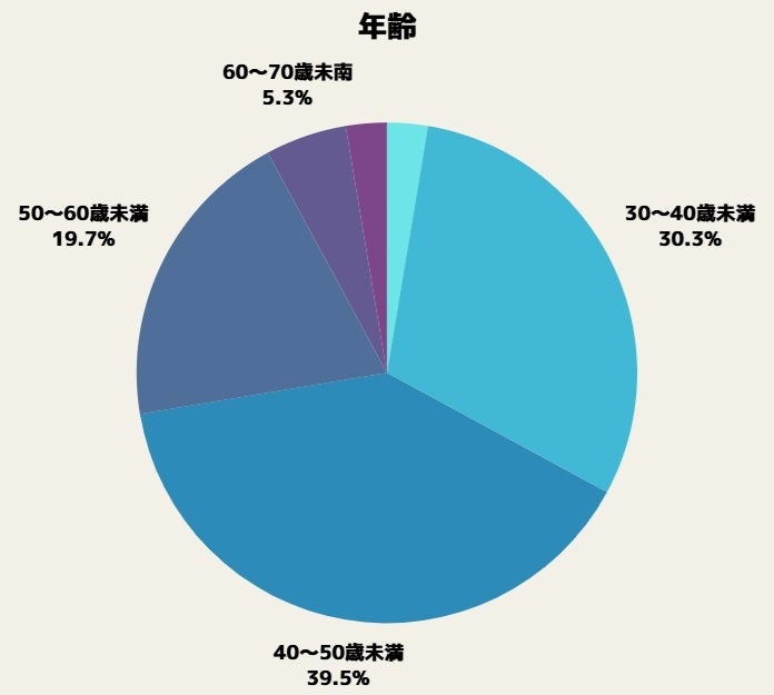 年齢は40代が最も多く39.5%、次いで30代が30.3%、50代が19.7%という結果でした。