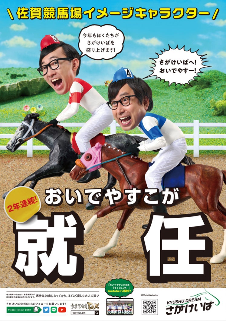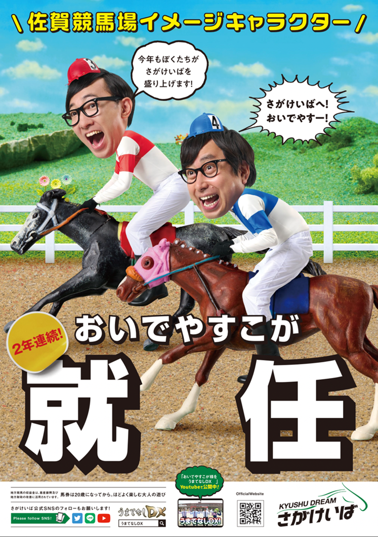 漫才だけでなく、バラエティ番組やドラマ出演、映画解説など活躍の場を広げ、老若男女問わず幅広い世代に支持されている「おいでやすこが」さんが2年連続で佐賀競馬場のイメージキャラクターに就任しました。今後、ポスターや現地イベントへの出演も予定しています。お二人を通じて、より多くの方に佐賀競馬を知っていただくきっかけになることを期待しています。