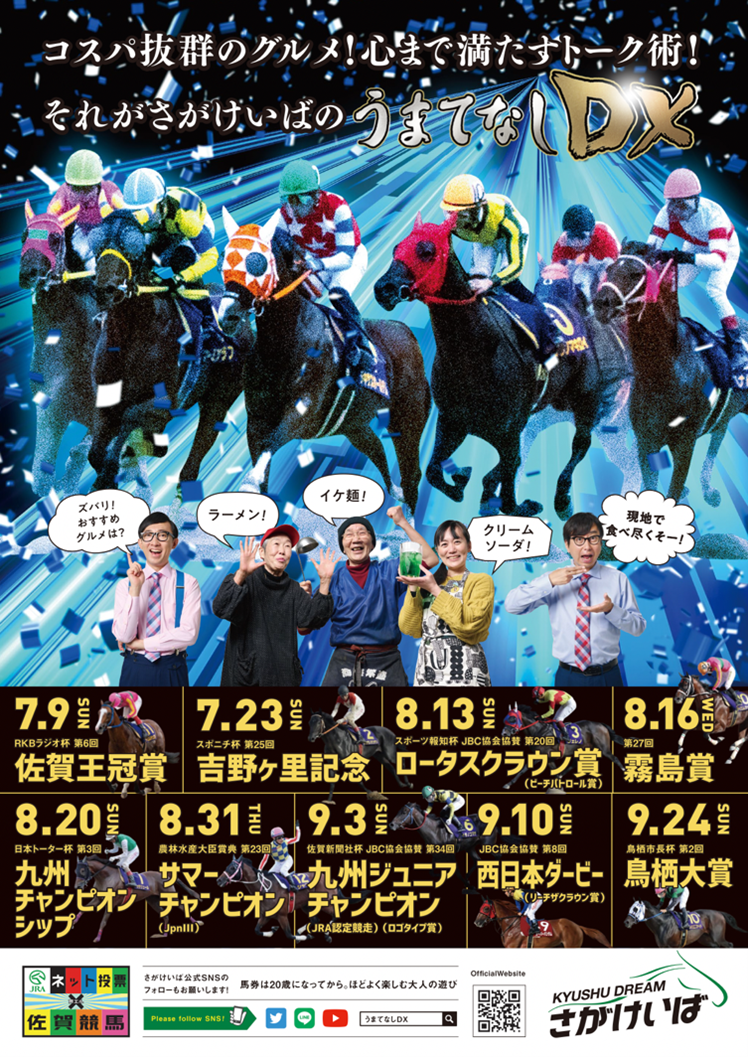 『おいでやすこが様をうまてなしDX』には、食堂スタッフ、解説員、予想屋など、佐賀競馬で働く様々なスタッフが出演。名物グルメのご紹介から、普段は入れない競馬場の裏側。騎手のプライベートまで迫ったボリューム満点な内容となっています。もちろんお二人はレースの予想にも挑戦。勝利の女神は果たしてどちらに微笑んだのか?全9話で構成されたWEB動画は順次公開していきますので、ぜひ最後までお楽しみください。