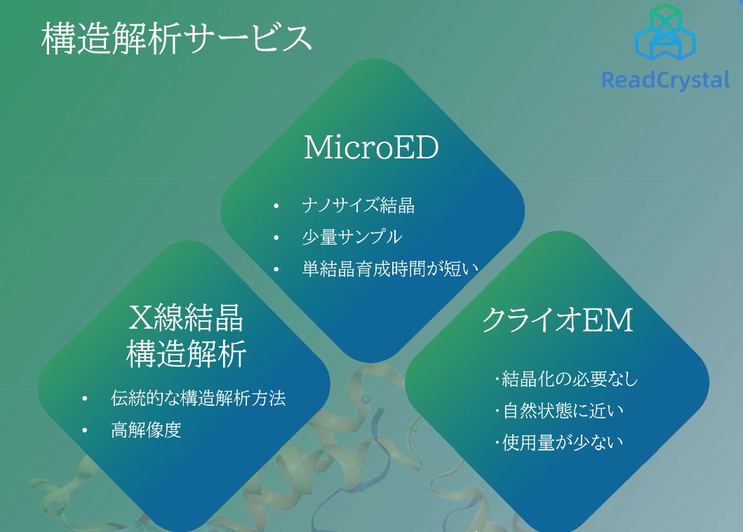 当社は、タンパク質構造の解析における時間とコストの課題を解決するために、ReadCrystal社(本社:中国・蘇州)と業務提携し、日本国内のお客様向けサービス提供をスタートしました。タンパク質の発現と精製、構造解析及び分子間相互作用解析のワンストップサービスをご提供可能です。
