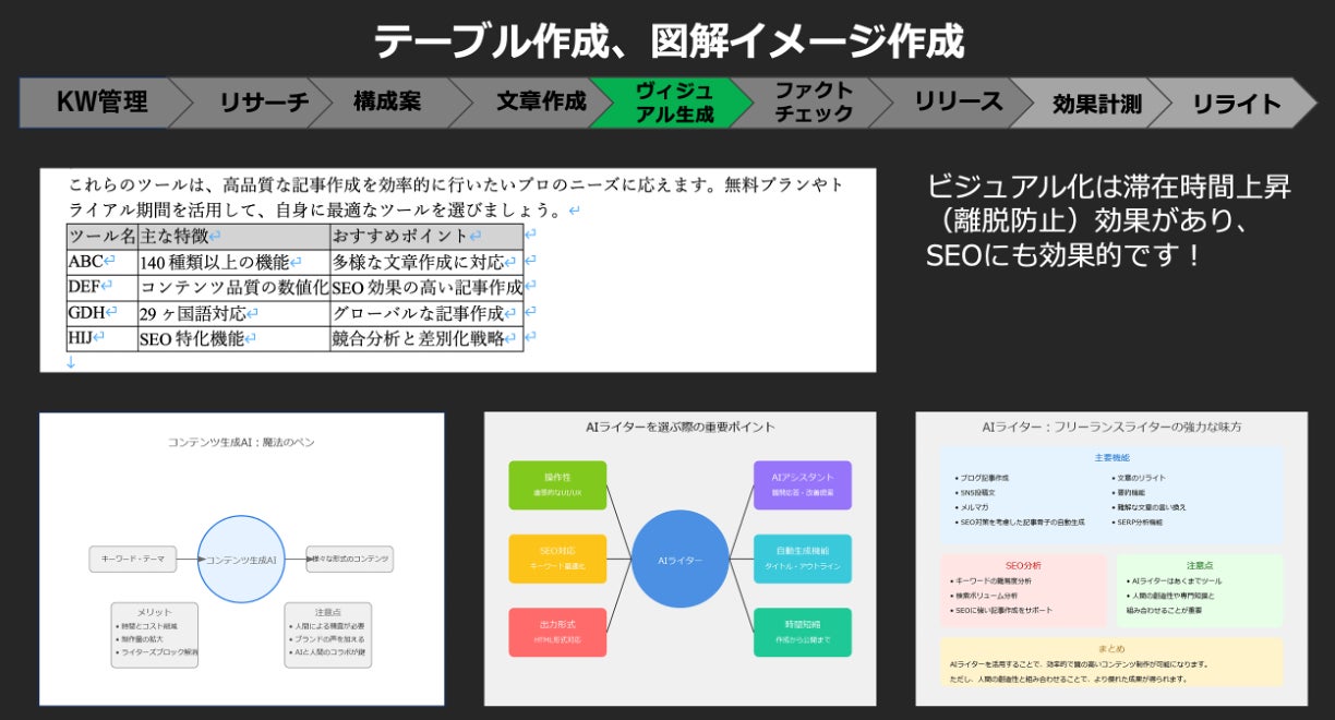 図解イメージ作成機能の追加により、UniCopiはSEO記事制作の全工程をサポートする総合ツールとなりました。