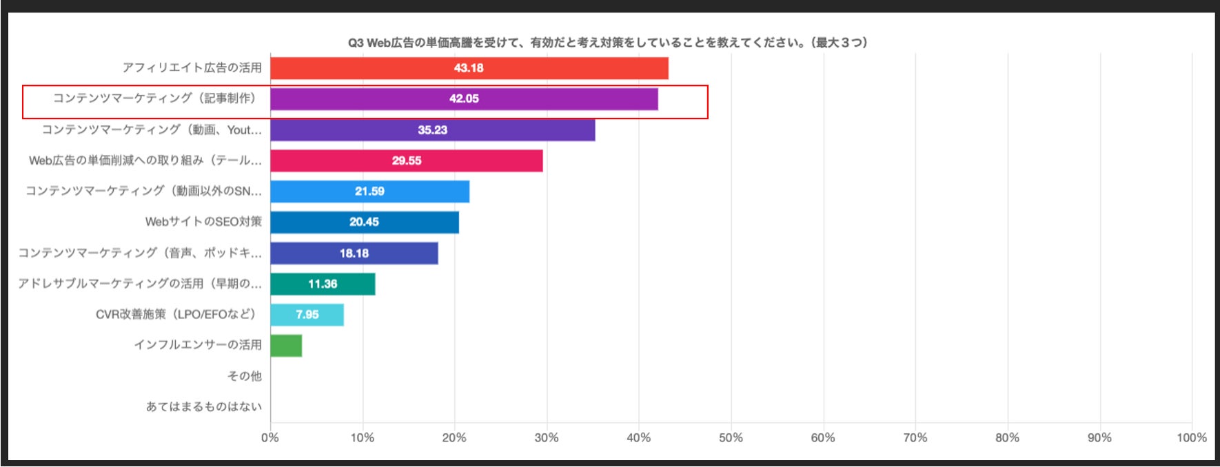 デジタル広告費の高騰(63.7%のマーケターが広告単価の高騰を実感:下図参照)している対策として、42%のマーケターがコンテンツマーケティング(記事制作)への注力をしていると回答しています。しかし、その過程で記事制作の時間と労力が大きな障壁となっていました。UniCopiは、この課題に正面から取り組み、AI技術を駆使して制作プロセス全体を最適化します。