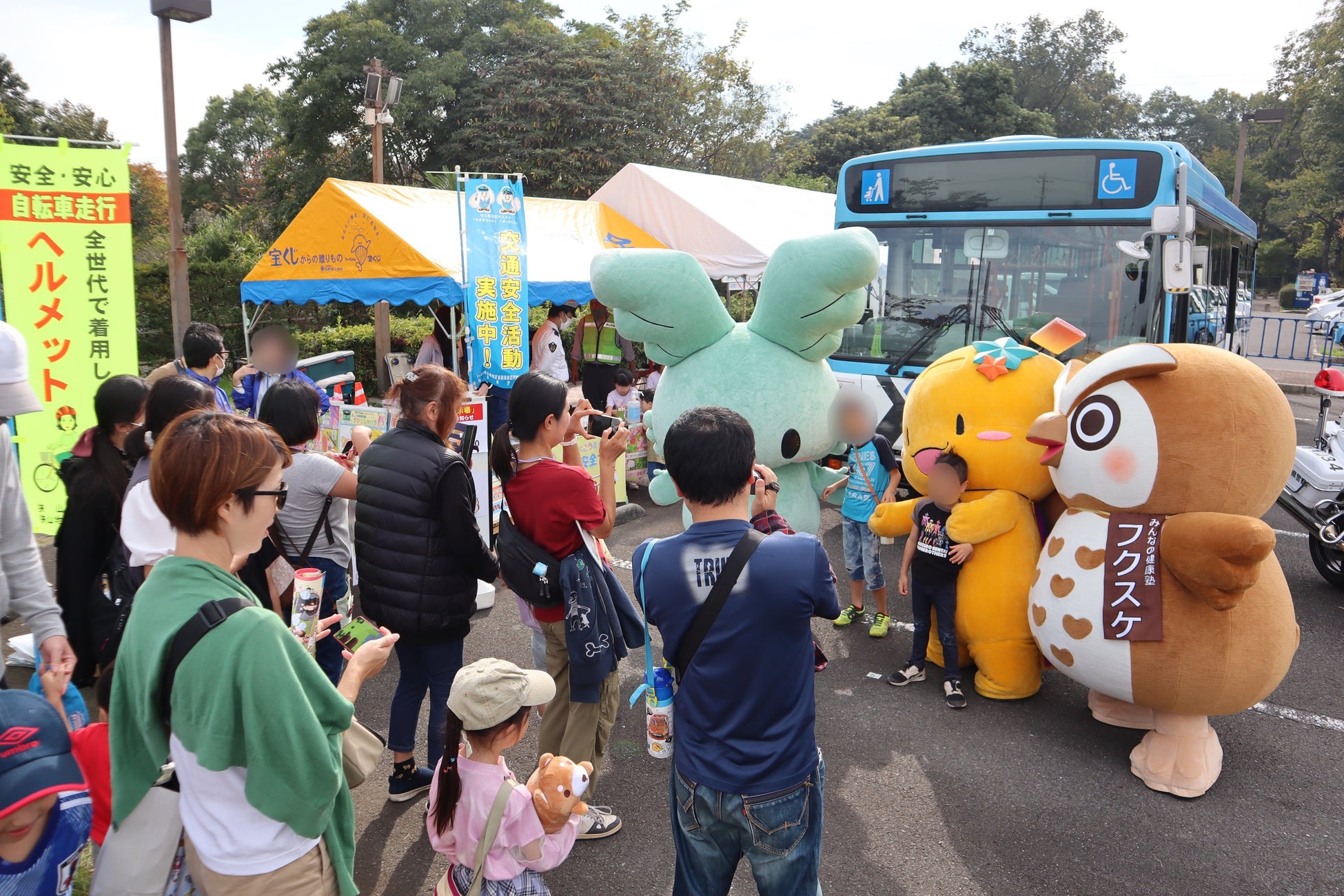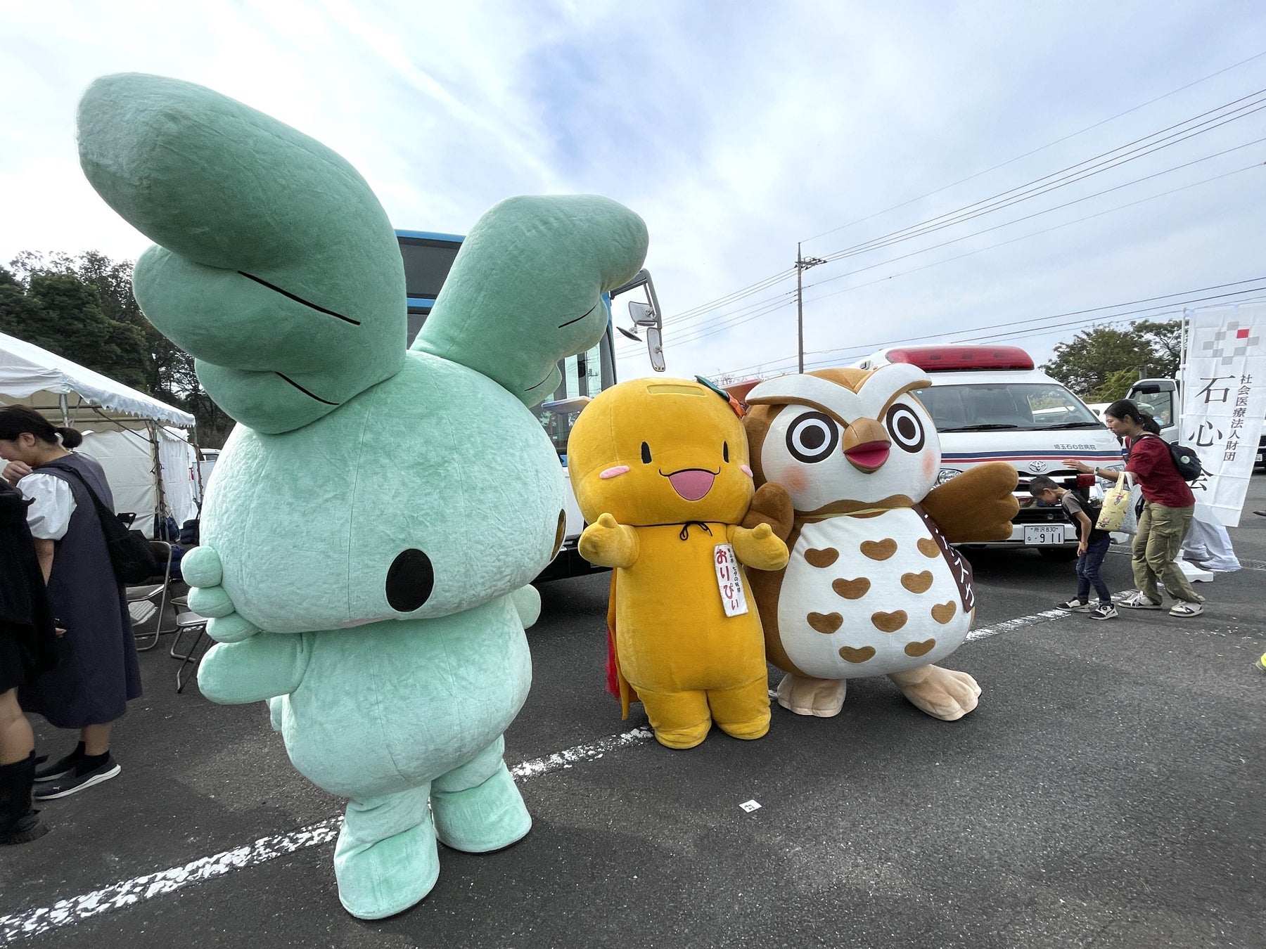 (左より) 西武バス公式マスコットキャラクター「エンジェ」、狭山市公式イメージキャラクター「七夕の妖精おりぴぃ」、みんなの健康塾キャラクター「フクスケ」、