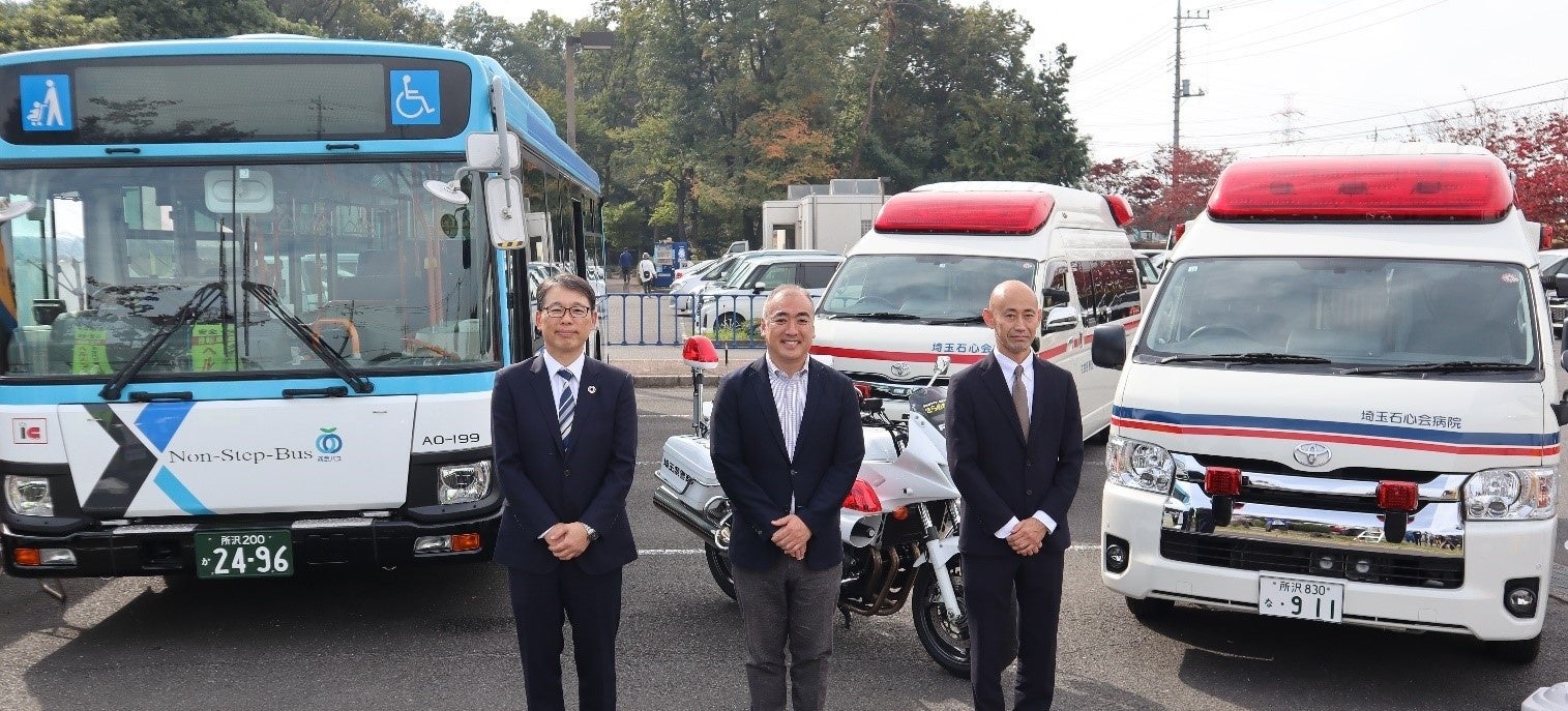 左より:塚田正敏・西武バス社長、小谷野剛・狭山市長、石井耕士・埼玉石心会病院長
