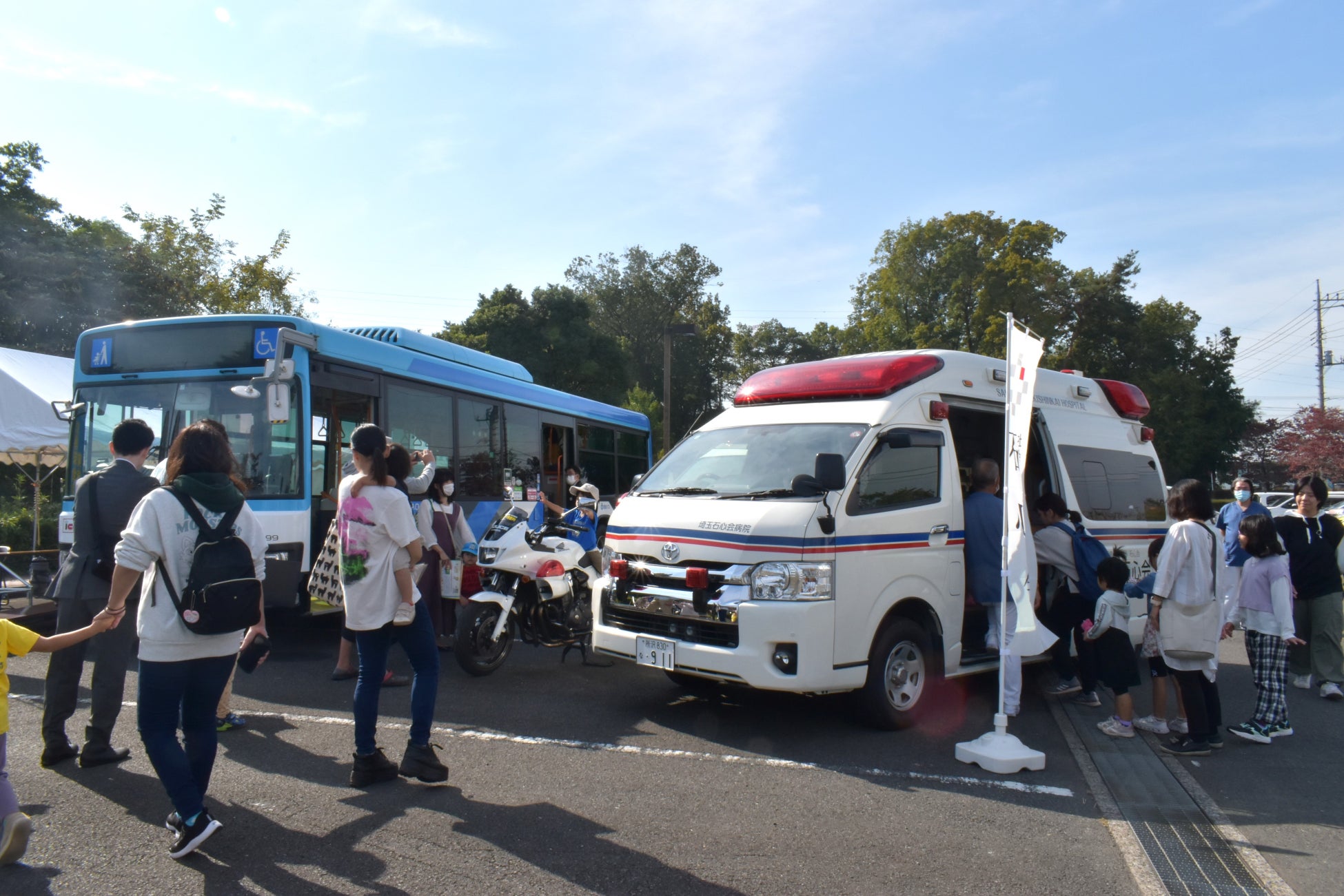救急車、バス、白バイが展示され、大勢の人たちでにぎわった